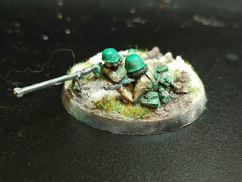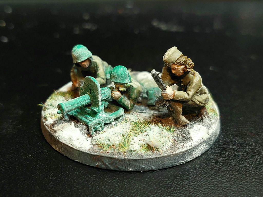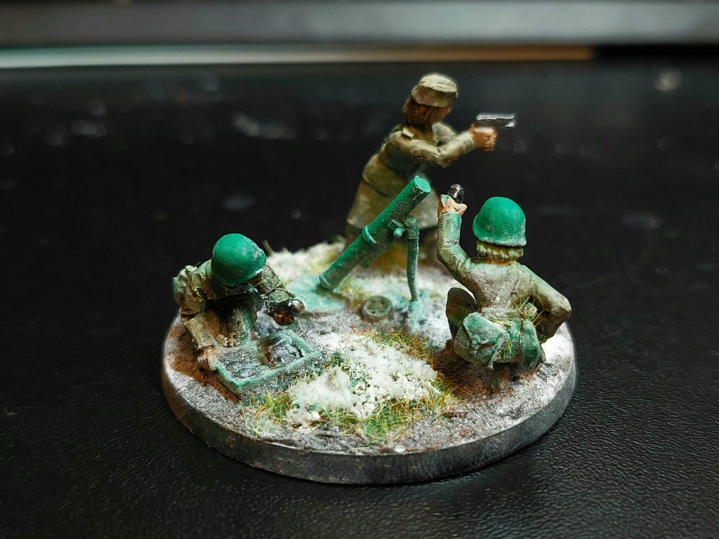 An OZhDSB mortar team. Credit: HardyRoachFor basing, I wanted to give the impression of the beginnings of snowfall. First everyone gets a layer of polyfill to cover up their puddle bases (I would have used the new Wargames Atlantic bases with the double-sided feature, but alas, I didn’t have them yet). Then a layer of Vallejo Russian Mud, which is a very dark brown with little chunks of foliage, followed by a drybrush of a deep brown. On top of that went Geek Gaming Scenic’s autumn flock, followed lastly by a dusting of their snow powder in small patches.