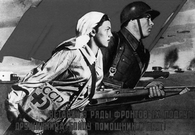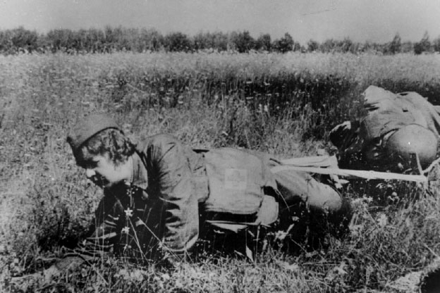 Paramedic, 1942On Sunday the 22nd of June 1941, Nazi Germany invaded the Soviet Union. Around four million soldiers drove deep into Russia territory, routing an unprepared and unprovisioned Red Army. Within 24 hours of the German invasion, thousands of Soviet women swarmed to meetings and recruiting posts, “begging, demanding and crying” to be sent to the front, weapons in hand. In cities, military commissariats were overwhelmed by young women, mostly aged 17-25, determined to enter combat, and the Komsomol, Stalin and the air force chiefs were inundated with letters from women Komsomol members. Though we lack firm data, it appears that in some areas women consisted of up to 50% of the applicants to join the army in the first months of the war, many of whom where accepted.
