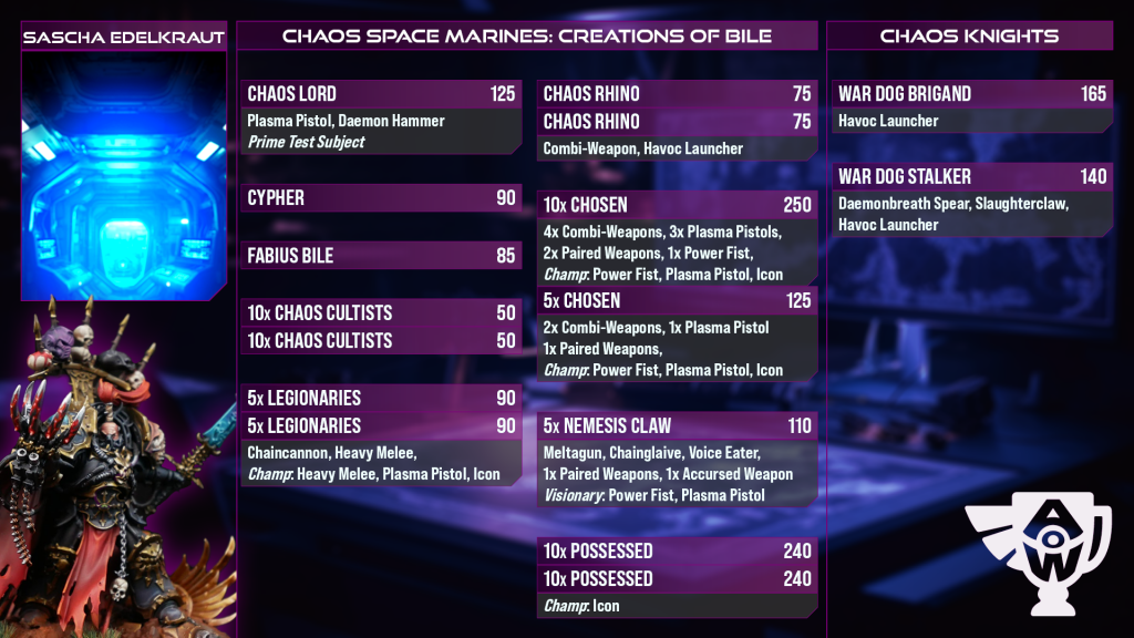 Wings: Creations of Bile has got speed, reach, and devastating melee power on its side, and also does extremely well out of War Dogs to lock in any positional gains. I played against a very similar list to this recently, and the combination of the pressure, the War Dogs to dominate objectives and Cypher to tank Command Points meant that the game slipped away from me despite feeling like I was in the driving seat for a lot of it. The sheer aggression gives it a good story to tell even into nasty shooting builds, and I think it’s one of the lists with a better shot of buzz-sawing through Quinton’s Sisters.The big spoiler matchup for it feels like Kyle’s Dark Angels, who combine the durability to soak a big push with the shooting and damage output to counterattack hard. Jack’s Custodes also feel well placed to give it a hard time, especially as their boosted shooting is incredibly real here.
