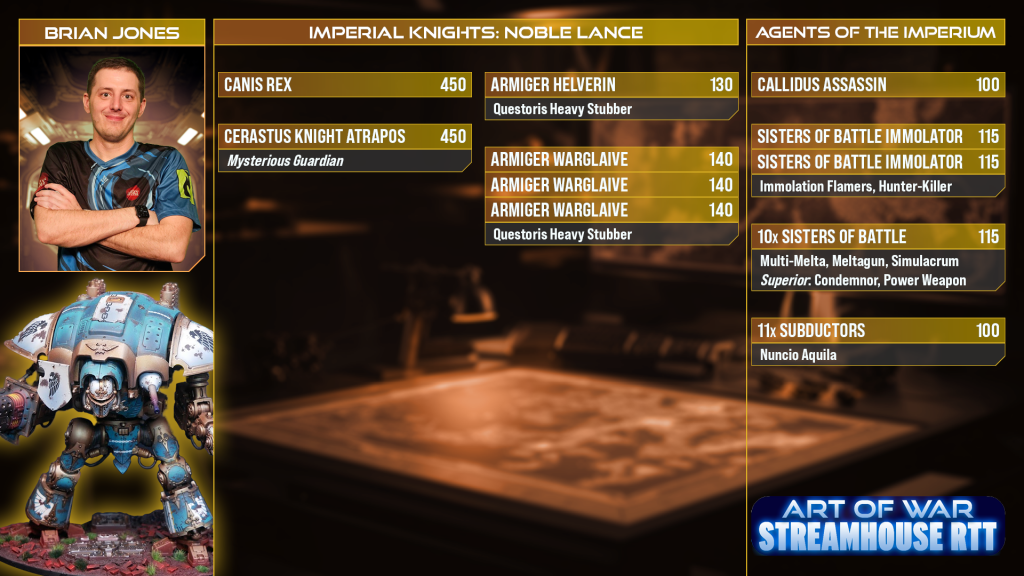Wings: Last but not least (featuring the largest models, in fact) we have Brian’s Knights, recently victorious at the Cherokee open. Brian’s build uses the ability to bring in Immolators to up his activation count and ensure that foes in cover have less change of spiking saves against the big stuff, helping maintain the momentum that Imperial Knights trade on. Those plus the Subductors give the army way more ability to screen out Secondaries right into the late game, which can help lock in an early lead.The Atrapos and Canis also have plenty of big targets to carve through out there, though need to watch out for getting Bloodthirstered or similar in response. Brian also needs to really watch out for Jack’s Custodes, which pose him all the same challenges they do to Daemons, but without +1D or end of phase mortals to help. The big Sacresant bricks may also be able to bog it down - Knights hate stacked hit and wound debuffs.