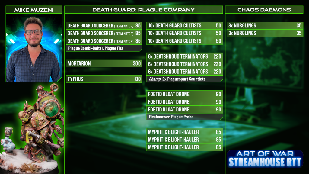 Wings: Grindy Death Guard here, maxing out on the always excellent Deathshrouds to ominously march towards the foe. Adding the cheap Daemon engines alongside those lets you get the foe into Contagion range early then keep them there, dragging their capabilities down into the muck while they get chopped up. Lots of Deathshrouds is also an excellent answer to Quinton’s Sacresants, though it’s also fairly vulnerable to Castigator shooting in response.Richard’s fast shooting once again feels like the biggest threat here - the army can punch up into a few things between Mortarion and the Sorcerers, but it can’t carve through hulls at the pace you’d want to handle the Mont’ka menace. It feels like it can cause real issues for builds like the Creations of Bile though, as they have to fight it on its terms, and may struggle to push through.