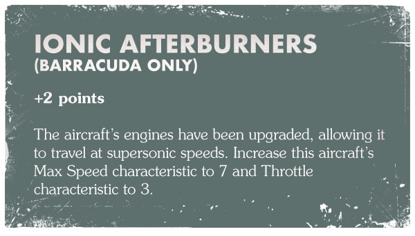 Ionic Afterburners is a 2-point upgrade for Barracudas that give them max speed 7 and 3 throttle. This gives them a higher speed and throttle than Thunderbolts.