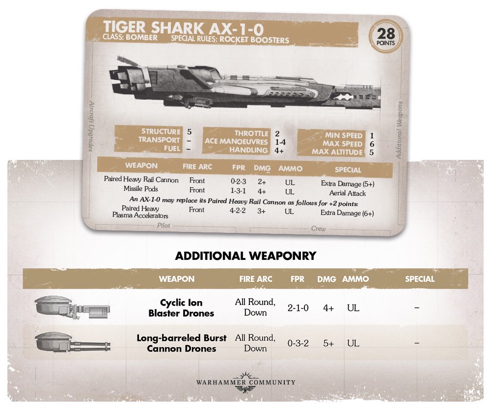 The basic Tiger Shark with turrets is 27 points. You can swap the main armament from railguns to ion cannons for +2 or burst cannons for +8. Burst Cannons and Ion Cannons have dice at all ranges, and as a slower aircraft being able to hit targets at any range can be a good idea. Of these two options I would choose ion cannons and I’d probably pair them with cyclic ion cannons, to give you 6 dice damaging on 4+ at medium range for 29 points. Similarly the defense drones and armoured cockpit upgrades are viable upgrades.