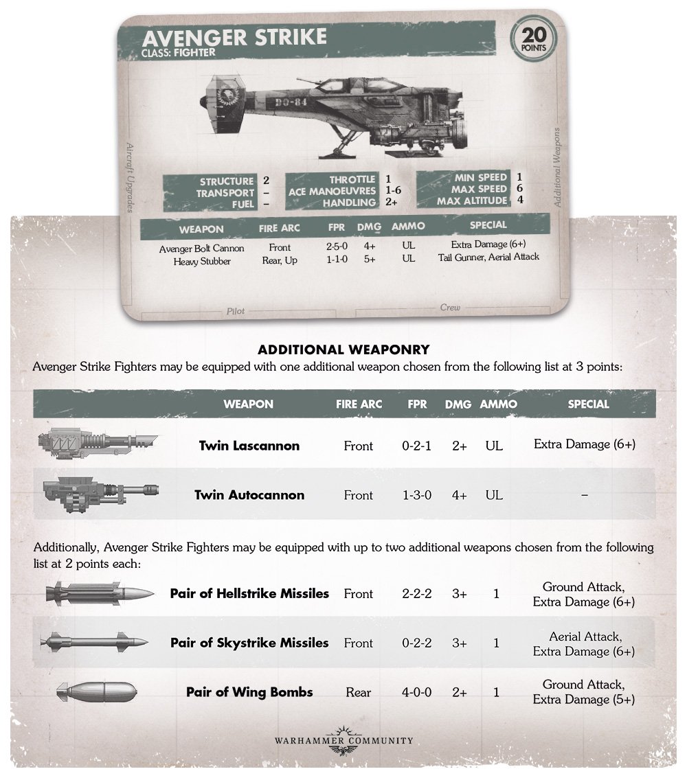 This fighter has an Avenger Bolt Cannon on a structure 2 body. While it weighs in at 20 points with no upgrades, it has two ordnance slots and can purchase either a twin lascannon or twin autocannon for three points. You’ll generally buy the lascannon, though the autocannon has it’s uses if you’re playing on a terrain heavy board in a low level flight game and you aren’t going to be using long range fire.