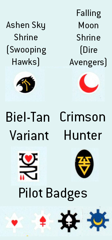These ones are a little odd, they don't really fit with anything but here they are anyway. There's a logo for a Swooping Hawks aspect warrior shrine, another Dire Avengers one, an alternate symbol for Biel-Tan (although you only get one), a small yellow-on-black version of the Crimson Hunter sign, and pilot badges for your grav tanks and planes.