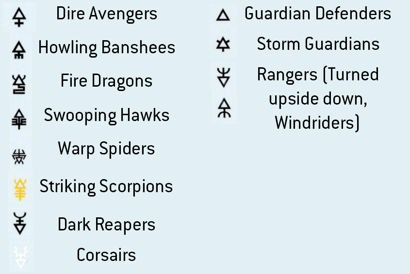 I like these because in some cases you can kind of see where they come from? The Scorpions have the sort of mandible, the hawks have stylised wings etc. On the older transfer sheet you'll find much larger versions of these runes, sized to mark what squad is inside a transport. There are 4 non-aspect warrior runes in here as well, confusingly, there's the Corsairs, the Guardians with their triangles, and the Rangers. Confusingly the Shining Spears don't have any transfers on the sheet - a little strange given they were one of the most recent relaunched kits. Warp Spiders are only available in metal from 1992 and they're on the sheet, but the new Shining Spears don't get anything, go figure.