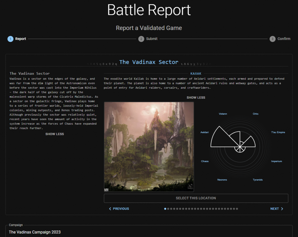 For our part, we've been hard at work on Administratum, updating the interface to handle the new Conquest mechanics we're using for the Vadinax campaign. now players reporting games can choose which planet they occurred on and see planetary control stats update in real time. We'll be continuing to improve this over the next few weeks and add even more cool features to the app.Next Week: The Saga Continues