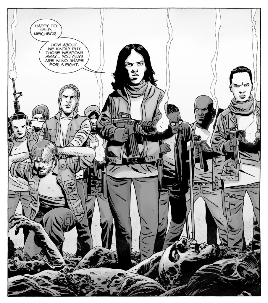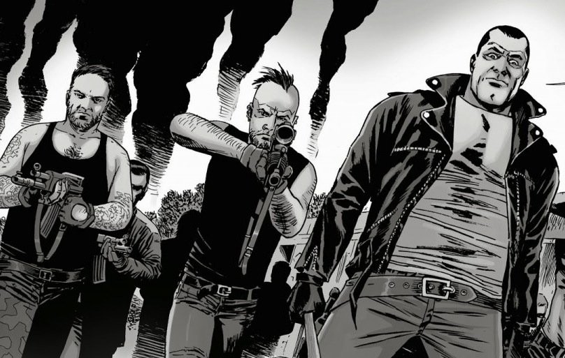Credit: Skybound EntertainmentWhen we first hear of the Saviors in the comics, they sent a group of Hilltop survivors back to murder Gregory for failing to meet their quota, quickly establishing them as a group that extort others under threat of death. We never quite learn the full extent of the power the Saviors hold, but it is enough to oppress at least three communities many hundred strong and wage an all out war (you see?) against them. And while they seemingly got very lucky with the gear they found (grenades, military grade weapons and plenty of vehicles), much of their presence can be attributed to their charismatic, foulmouthed leader Negan. From the moment we meet Negan he shows himself to be someone who believes in himself just a little too much. And his domineering presence leaves such an impression that the Saviors end up following two more strong personalities, Sherry and Dwight, before they finally being to appreciate a more communal style of leadership.