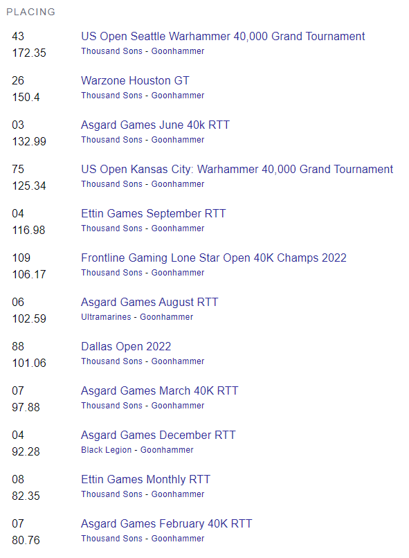 Likewise, I'll finish outside the top 30 for Thousand Sons; it's a very crowded faction as, unlike Death Guard last year, they didn't spend the entire year getting progressively worse. I'd need a placing better than 26th at a big event to even have a chance.