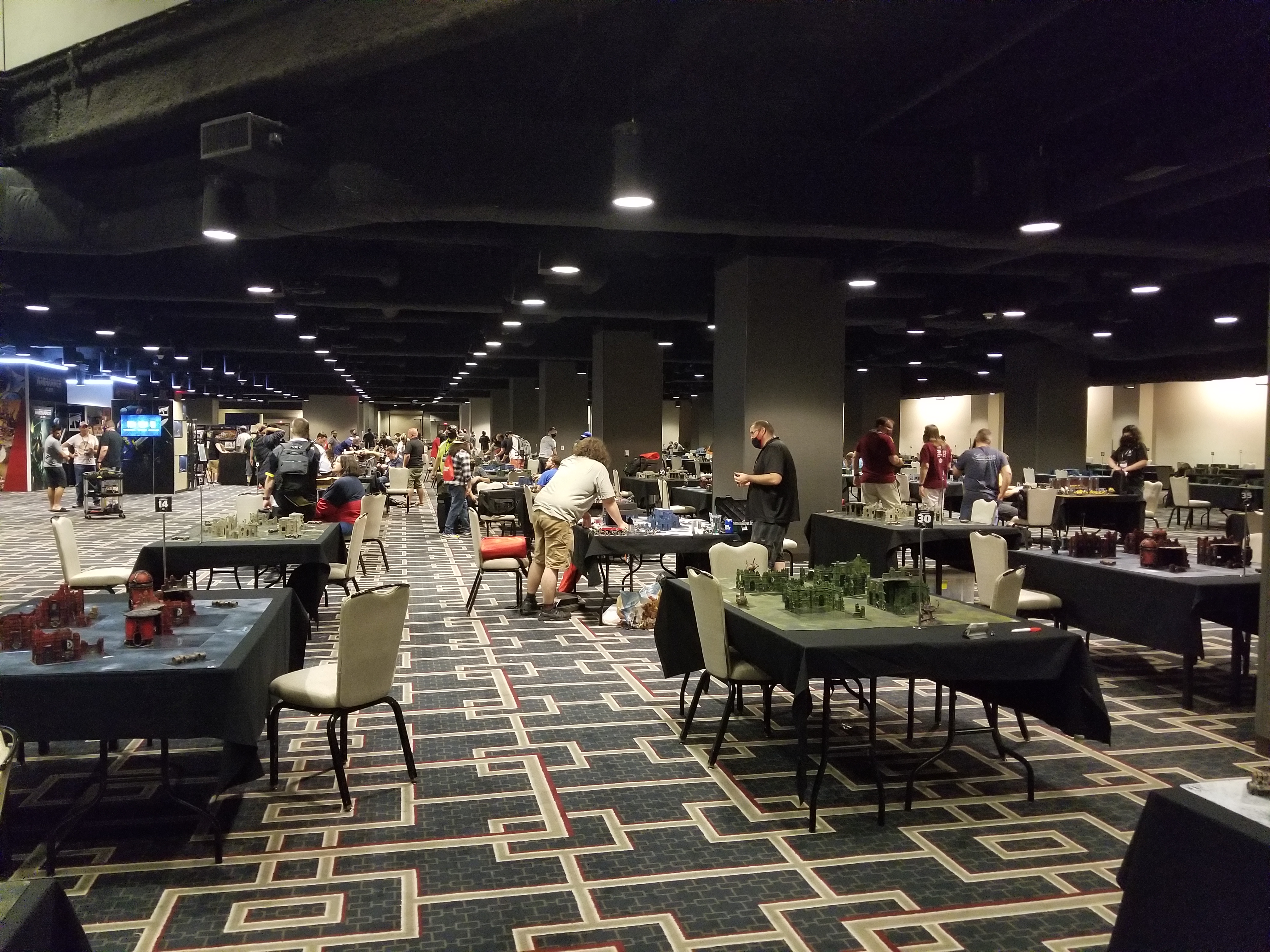 People shuffling in on day 2The big difference between day 1 and day 2 is that on day 2 a series of "rolling WAAAGH!s" have started happening a few times per round. There's a guy - presumably an Ork player - walking around with a cosplay Ork chainsword starting the yells and when they do, nearby tables join in and the whole thing kind of rolls through the hall like the wave at a baseball game. It's also about as exciting as the wave, and your mileage on this will vary based on how fun/cool you think it is to do the wave at a stadium, I suspect. It's also very loud and I'm still hungover, so my mileage isn't super long but I'm also not about to poo-poo the process because it seems like good harmless fun.