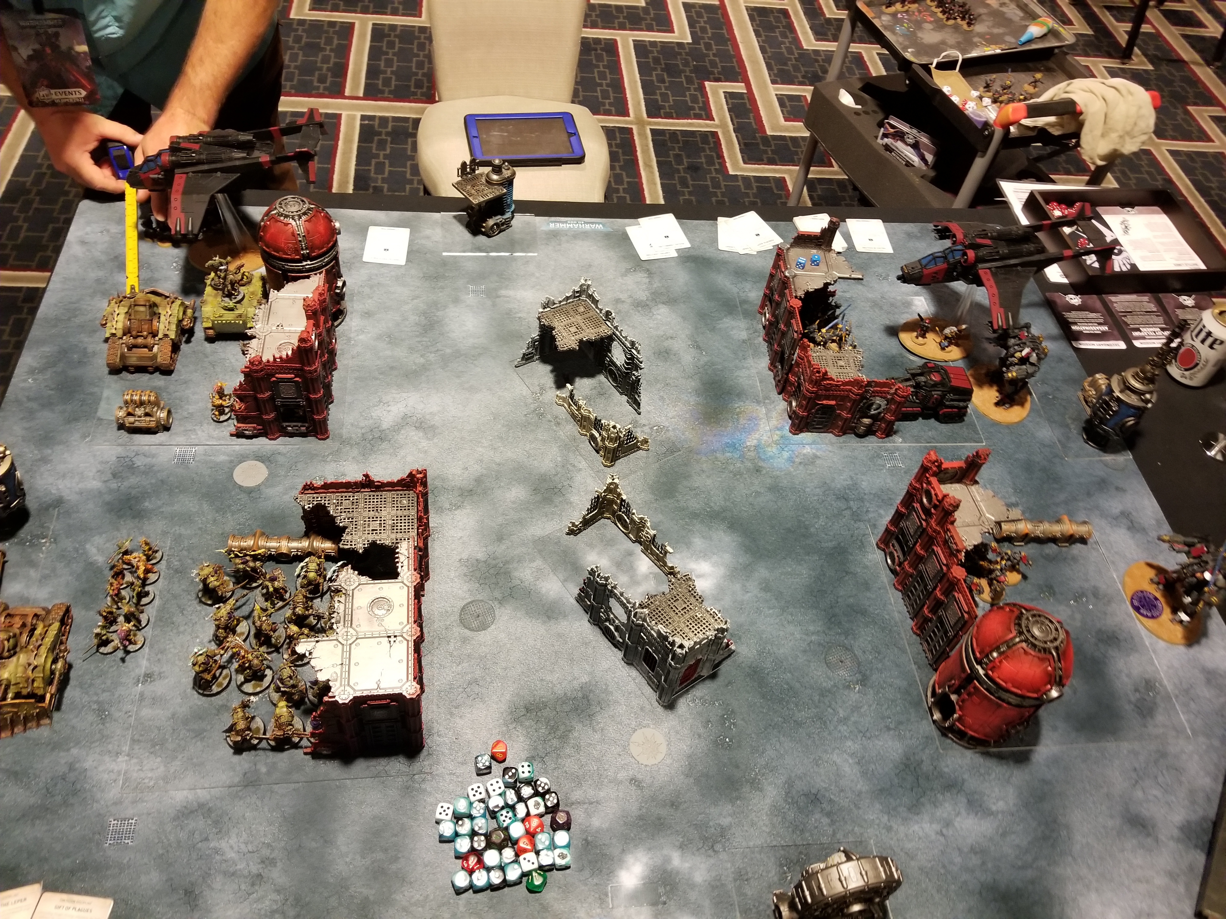 Mortarion can be a real challenge if you don't know how he works and how to deal with him. Unfortunately for Darin, I absolutely know how to deal with him, having played him many times before. Likewise, Darin's list has some major flaws, the biggest being that his Daemons Detachment isn't a SLAANESH detachment, so I don't have to worry about Be'lakor being able to advance and charge and crash into my lines at the start of the game. I get first turn for the first time this event and it's a HUGE advantage for me - not only does it give me two turns to act before Darin's Obliterators arrive, but it also gives me two turns to pry Nurglings off objectives before his first Data Intercept action will finish, turning what could be 4-5 victory points to 2-3. This also lets me shoot and set things up for when Morty does arrive.