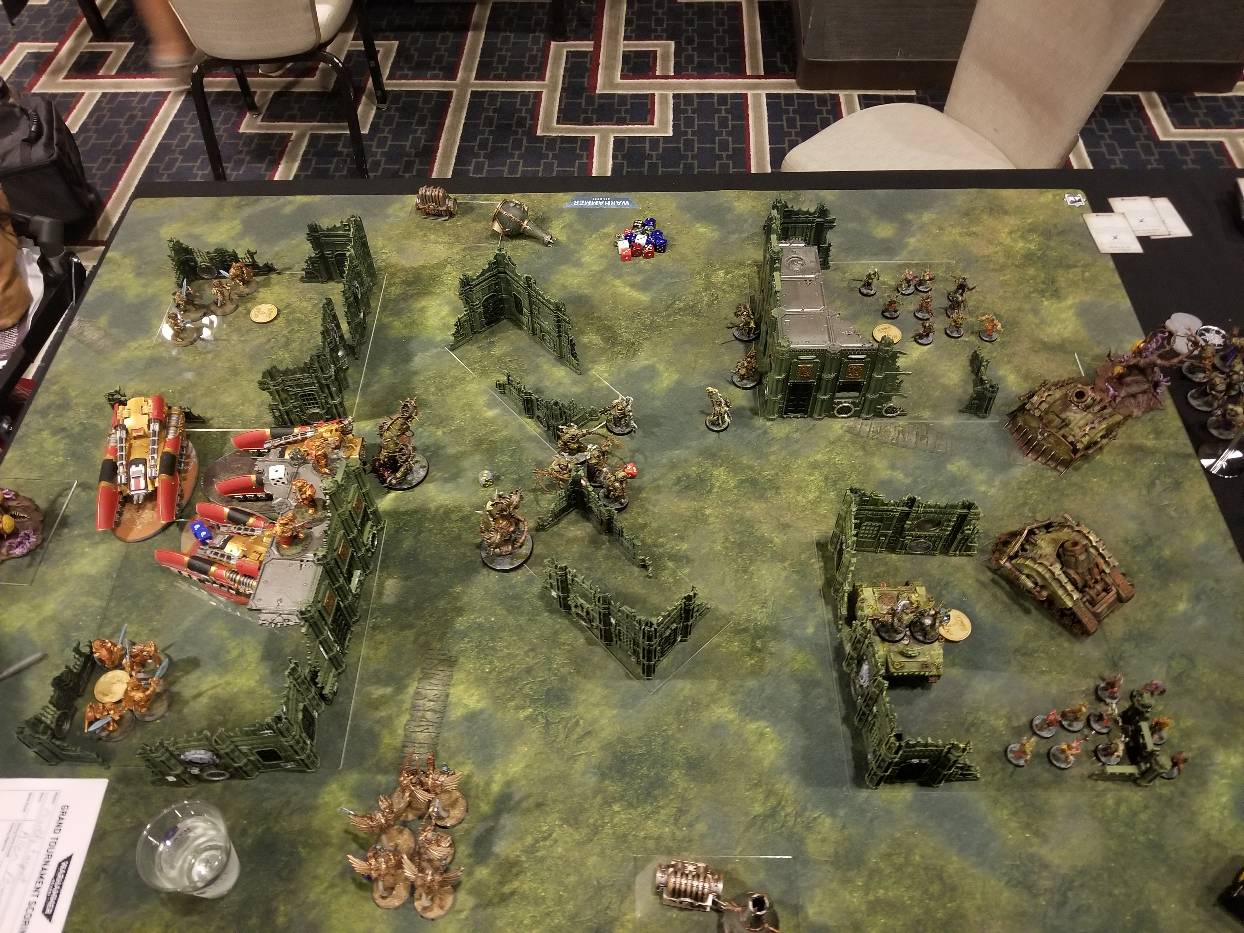 This game is a nail-biter start to finish, and the closest game I play all weekend. Naturally, I start it off by fucking things up badly. Allen gets the first turn, which means I have to deal with Venatari on turn 2 and some early shooting, and zips his Jetbike captain right up to the middle of the table but behind cover. This gives me about a 14" gap to cover moving his way, and I bet big on my Blightlords being able to take out the Captain with mortal wounds.
