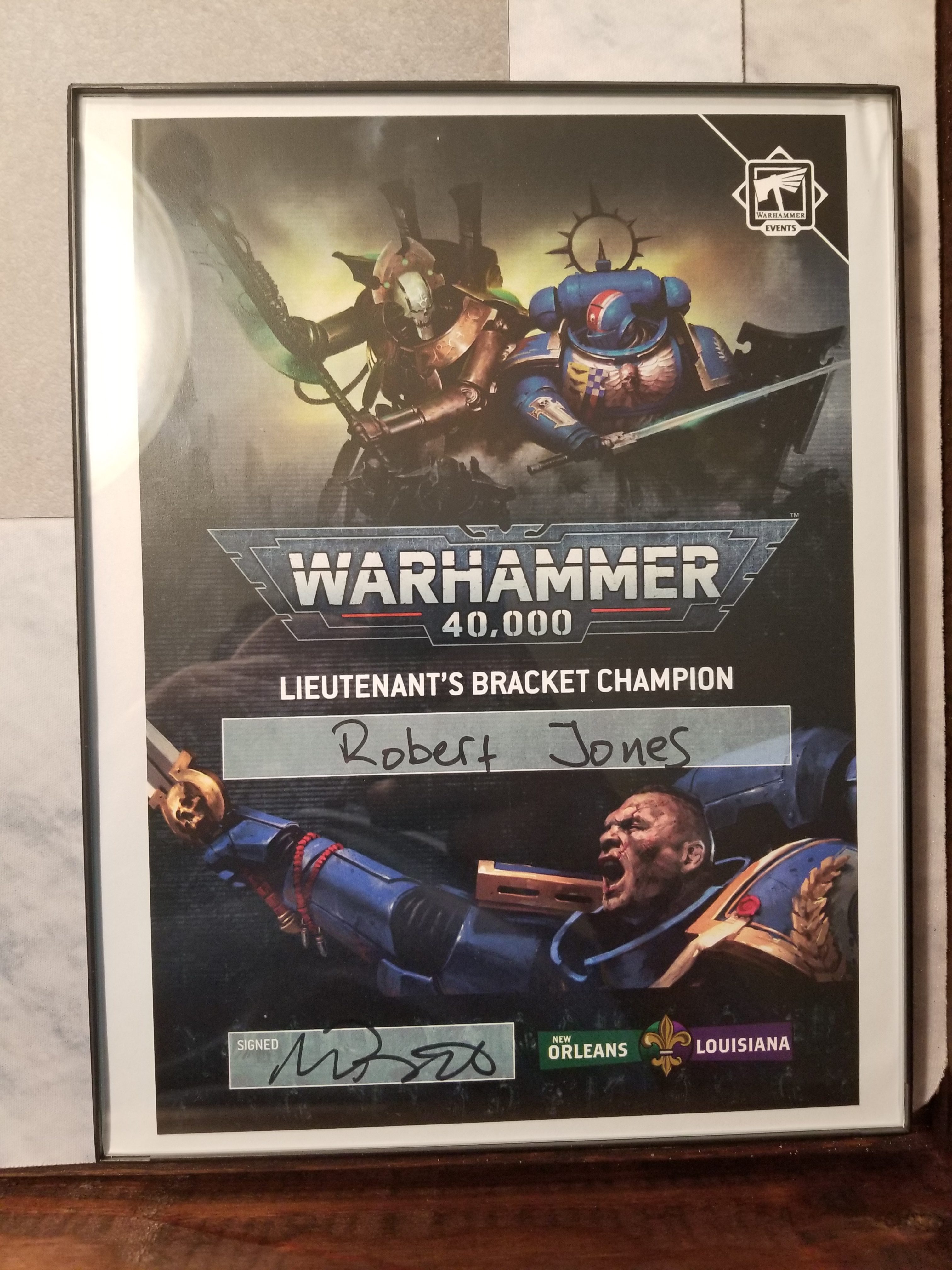 You're goddamn right I hung this on the wall6-2 is much, much better than I was hoping for and finishing 4-0 in my bracket means I'm one of four champions in the bracket, which means I go home with a hastily-framed signed sheet of paper telling everyone that I am a champion of the Lieutenant's bracket. And I fucking love it. It's going to look wonderful on the walls of my gaming space, and it's a pretty crazy testament to how far I've come in this stupid game. On the five-and-a-half hour ride home Swiftblade looked at me and said "Rob if you say you're a mediocre player after this again, I swear to shit..." and I had to begrudgingly admit that he was on to something there. So as of this moment I will no longer refer to myself as a "bog-standard, run-of-the-mill 40k player," but instead an "above average" one.