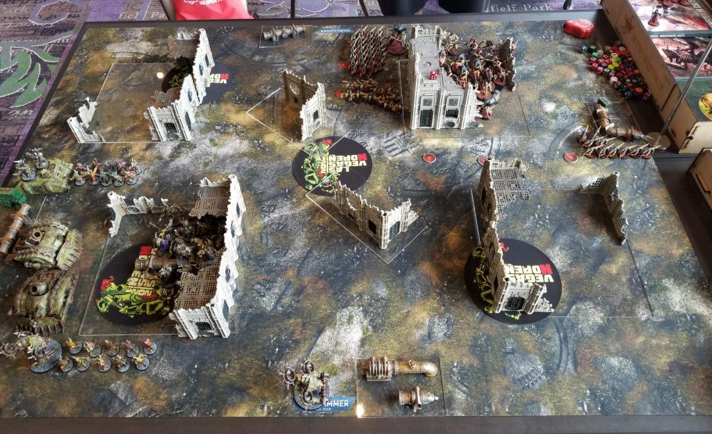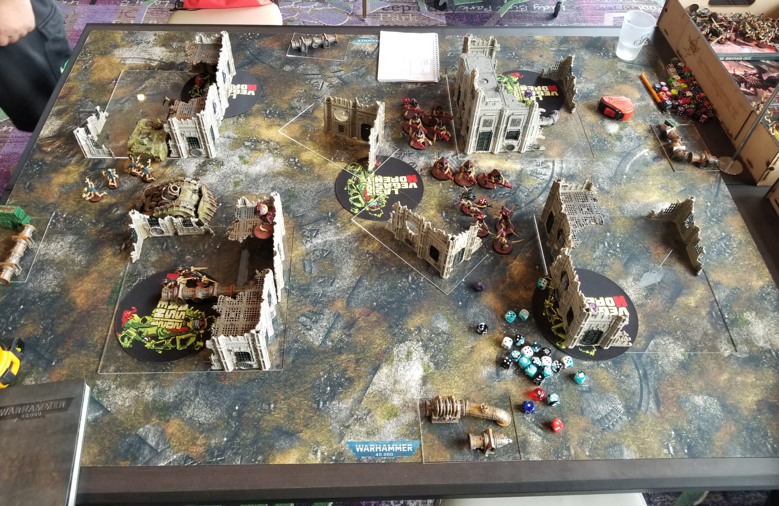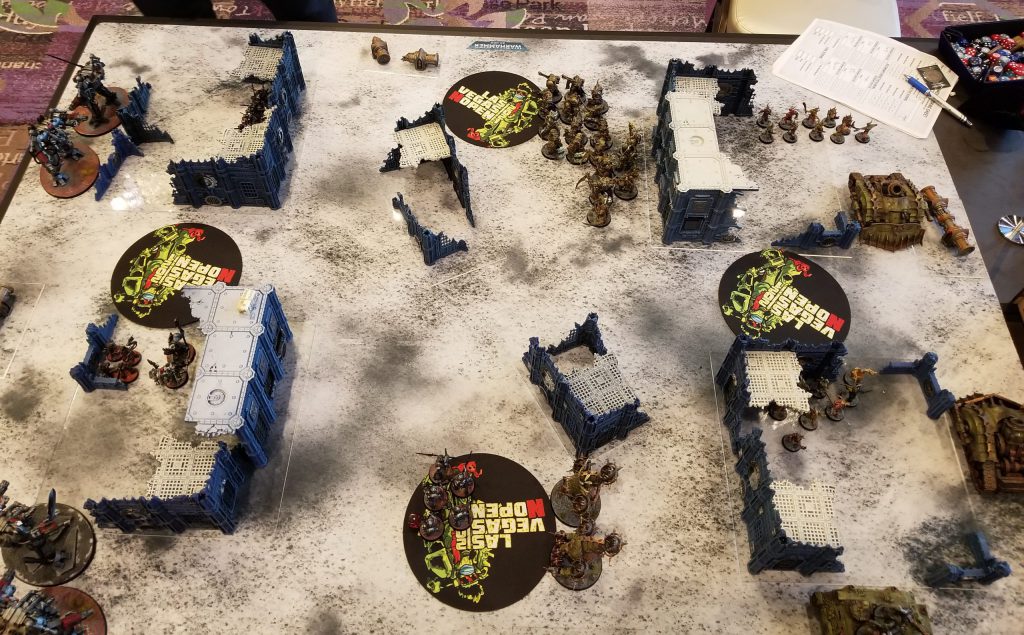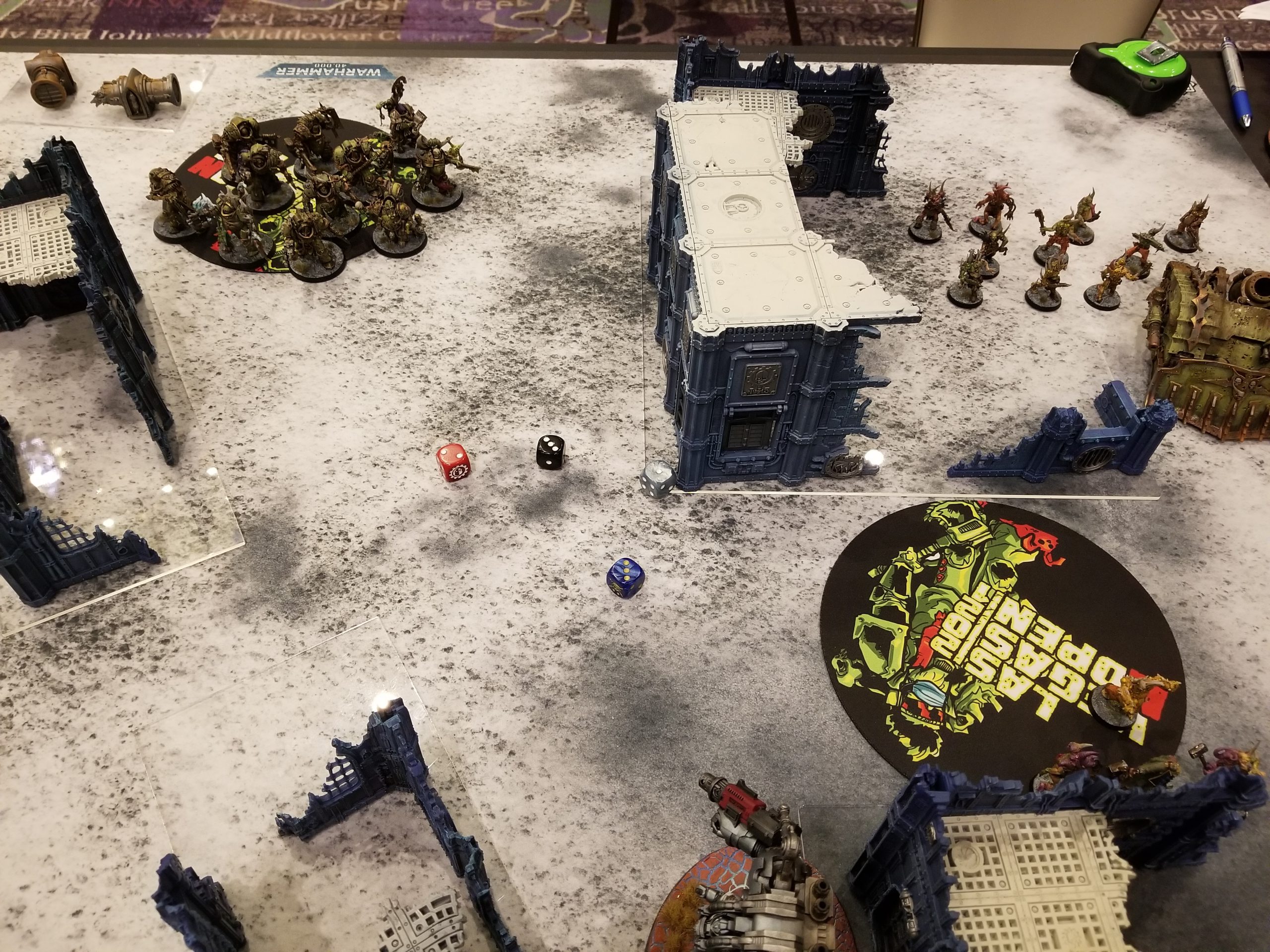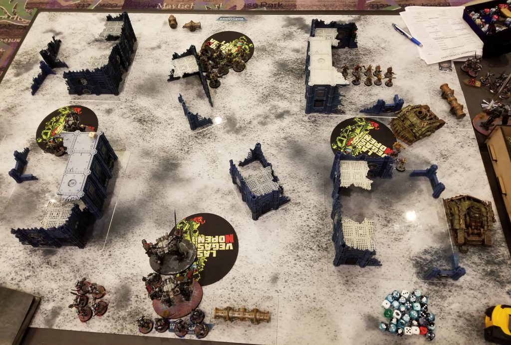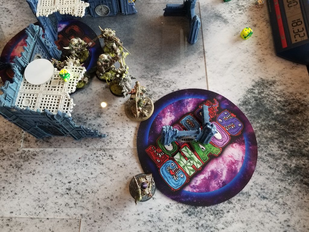 The dice mark where his Dreadknight can teleport to on turn 5Garrett plays a tough game - he's a good player - and we grind out a hard battle, mostly fighting over the midtable objective the Blightlords aren't sitting on. I don't commit enough to it - I needed more than just my deathshrouds walking over - and when I can't take out a second Dreadknight, that's enough to tip the game in Garrett's favor. Working in my favor is that Garrett has some real bad psychic tests and I manage to deny 2 casts of Purifying Ritual for him to deny 2 VP during the game, but fall short on the third one (I roll a 6 when I need a 7). We grind it out until turn 5 when Garrett is able to get off all the casts he needs to put himself over on Engage with 3 points. With smarter play I could have completely blocked him out of my deployment zone but he can probably still kill my wounded PBC even if I block him out. As-is, that gives him a 73-72 win and it would have been 72-67 even if I'd done that better since I'd have only prevented 1 point and forced him to kill the PBC. A very close game and a tough loss for me but Garrett's a great guy and a pleasure to play. After round 5 I was very, very glad to be playing a friend in a game where we could both just relax.