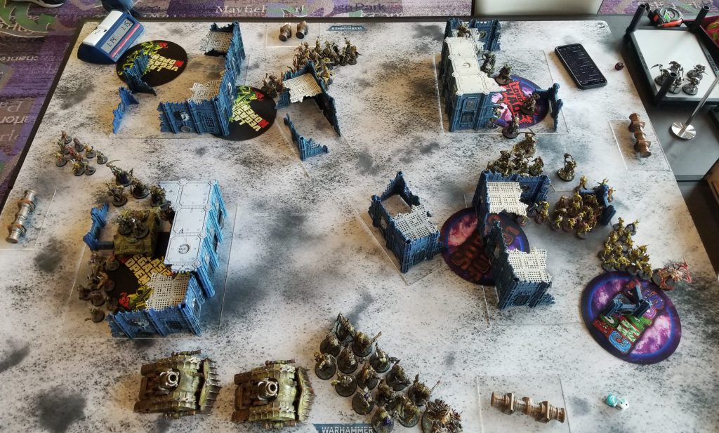 This all goes down two minutes before round 6 starts and the only thing that saves me from wanting to just drop is that I'm up against my friend Garrett Moore, who's been tearing things up with his Grey Knights. Those of you who have been following along may remember that the last time I played against Garrett we did a practice game on my worst mission, Battle Lines, and I got shithoused. Well, as fate would have it that's the exact scenario I get to try and squeeze out a win in a third time.