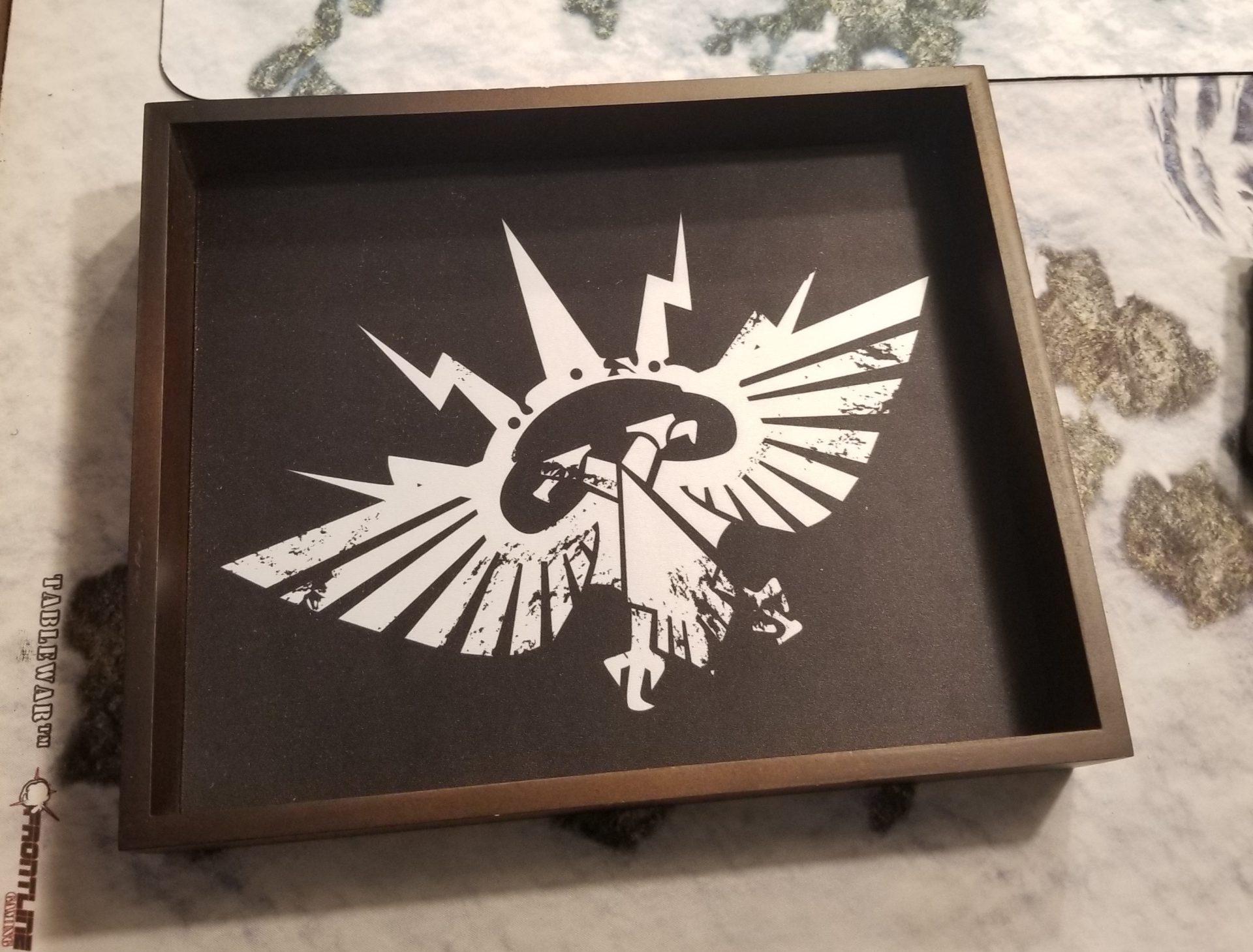 The tray in action. OK, not really - this is staged. I hate those GW dice. They roll like complete shit for meIt's surprisingly sturdy, and can be moved around anywhere on the table with enough ease that you'd do it before any given game, but it also is hard enough to move that it isn't sliding around. The tray worked very well in my first game playing with it. More on that in a bit.