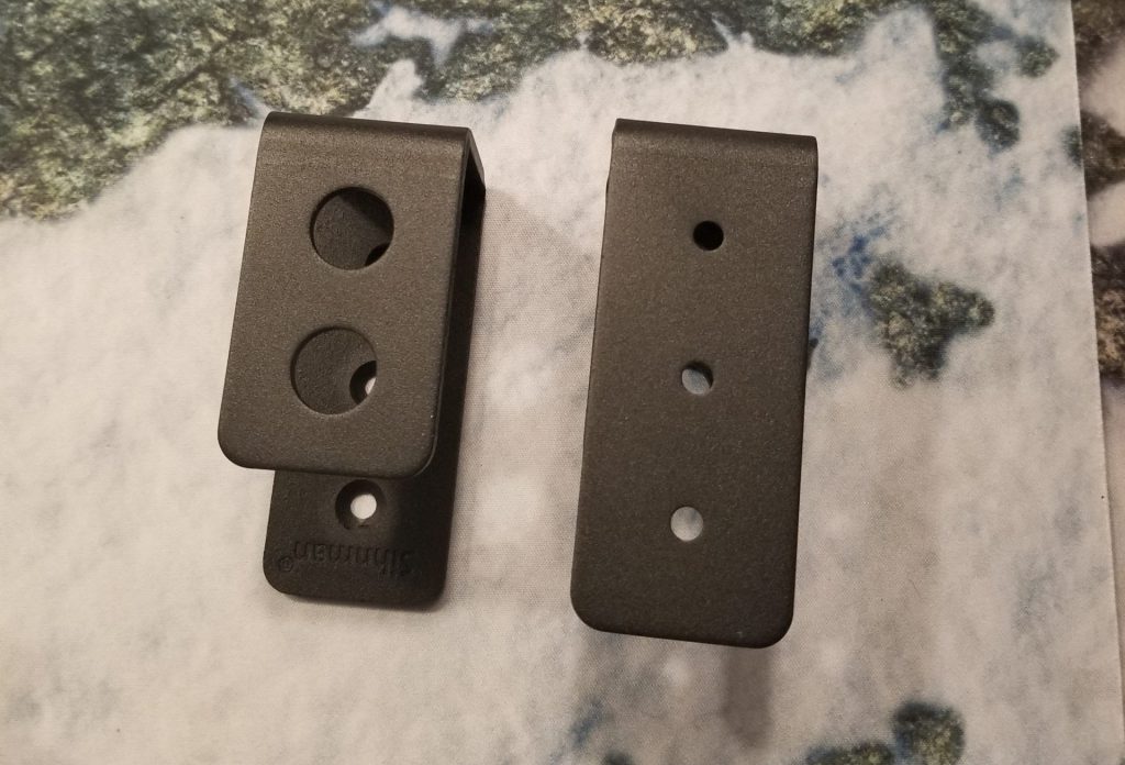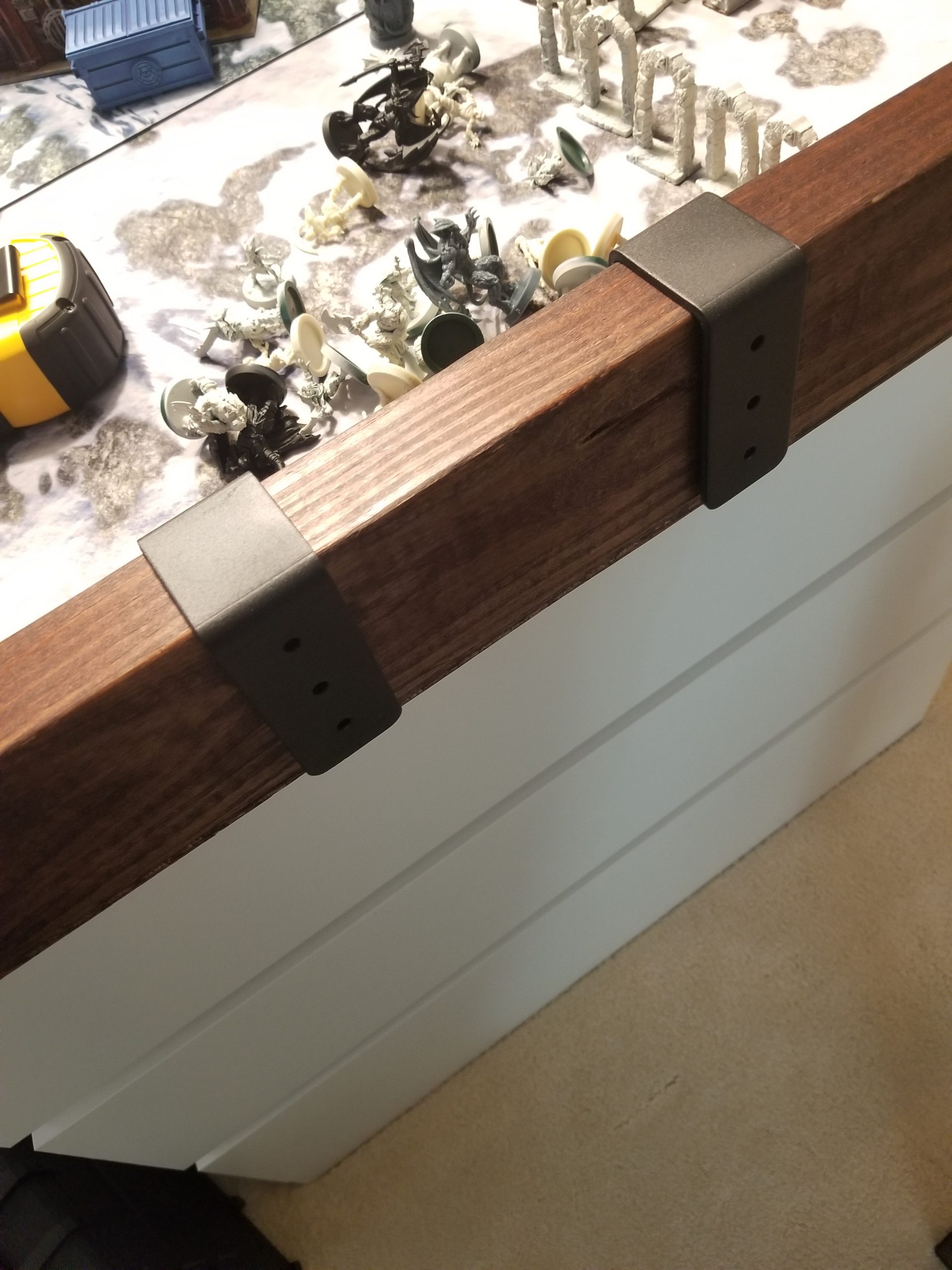 Totally normal things to ownThis is a pretty simple process. I picked up two iron barricade brackets - they're designed to hold a 2x4 across a door for when you want to barricade a door - because they were basically the only thing I could find that had the U-shape I needed to fit over the 2x4s that made up my table. Then I took a power drill, put two holes in the side of my dice tray, cleaned out the sawdust, and then ran two bolts through it. I went with bolts here on the chance I want to remove it later, and because wood screws would have required me to file off the pointed ends and that would have been more work than it was worth.