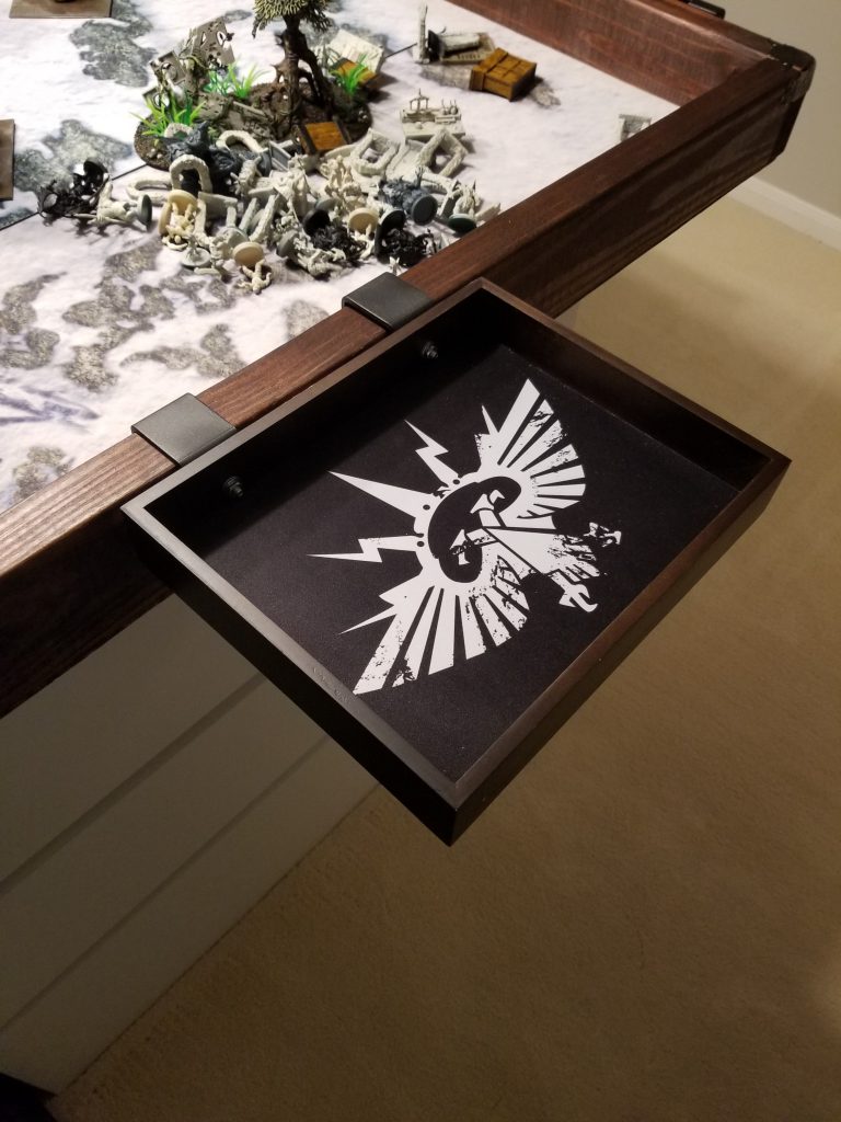 The mounted trayThe end result is a dice tray that fits nicely anywhere on the table, and when it isn't being used can be stored hanging over the inside of the table. This is important because it stops my son from inevitably breaking it or running headfirst into the obstruction on the side of the table as he runs top-speed on his circuit through the first floor of our house.