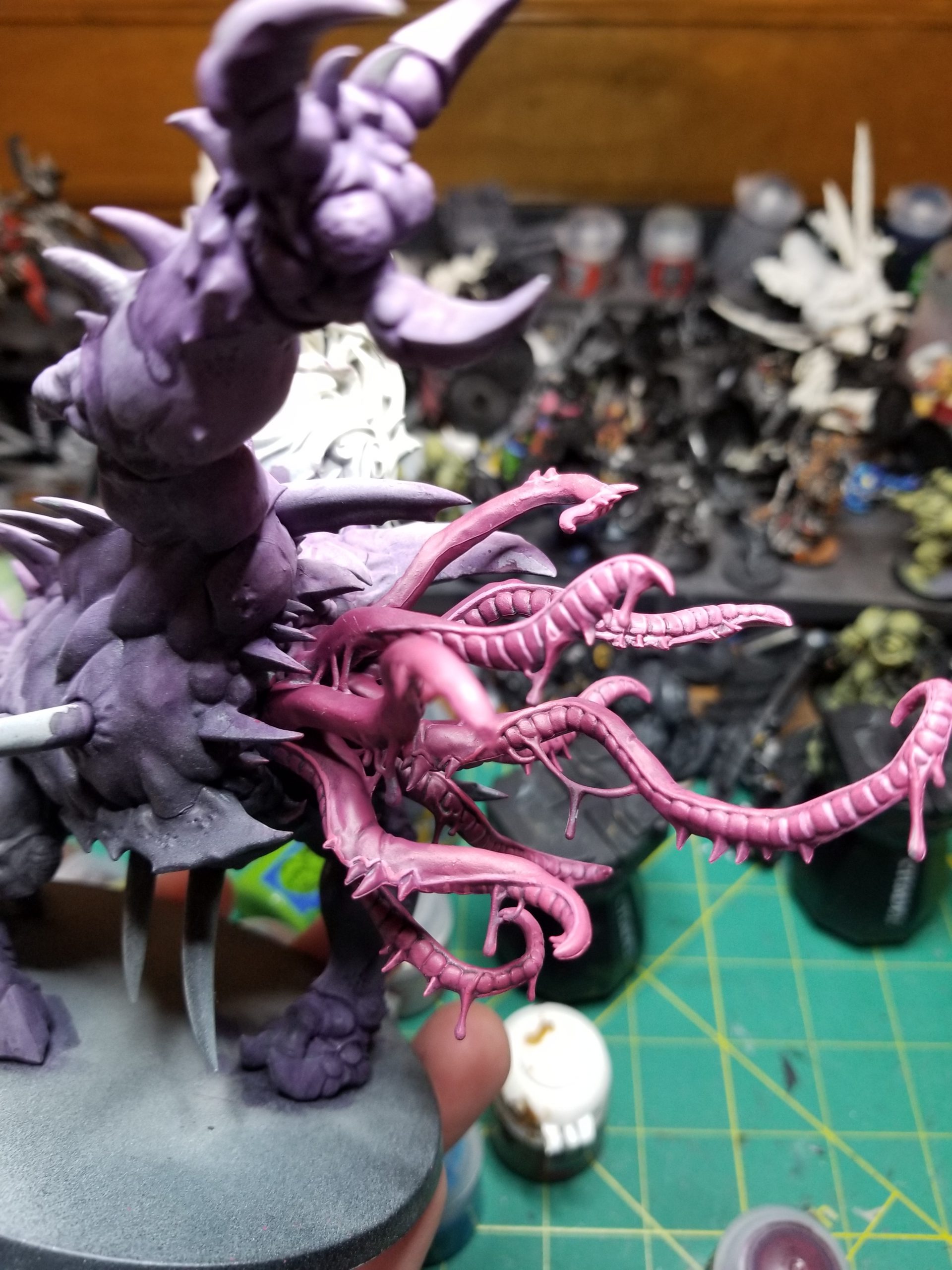 Credit: Robert "TheChirurgeon" JonesIn addition to my first squad of Rubrics, I also painted up the Mutalith Vortex Beast. I've had this model for a long time. I used the slaughterbeast half to convert up a Chaos Knight and since then he'd been sitting in my bitz closet. So a couple months ago I pulled him out, dusted off the sprues, and assembled him. I went with a relatively simple paint scheme, doing mostly pinks and purples, with a bit of OSL for the flame. The tentacle maw is my favorite part, and was the most fun to paint.