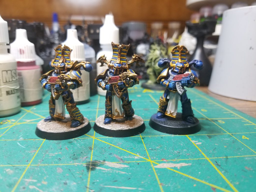 So I've been painting Thousand Sons. Because I'm a dumbass, I'm painting them with a more 2nd edition style scheme that uses a darker blue instead of the pre-mixed teal that the 'Eavy Metal studio currently uses for them. I like how this looks but it means painting them is more work than it needs to be.