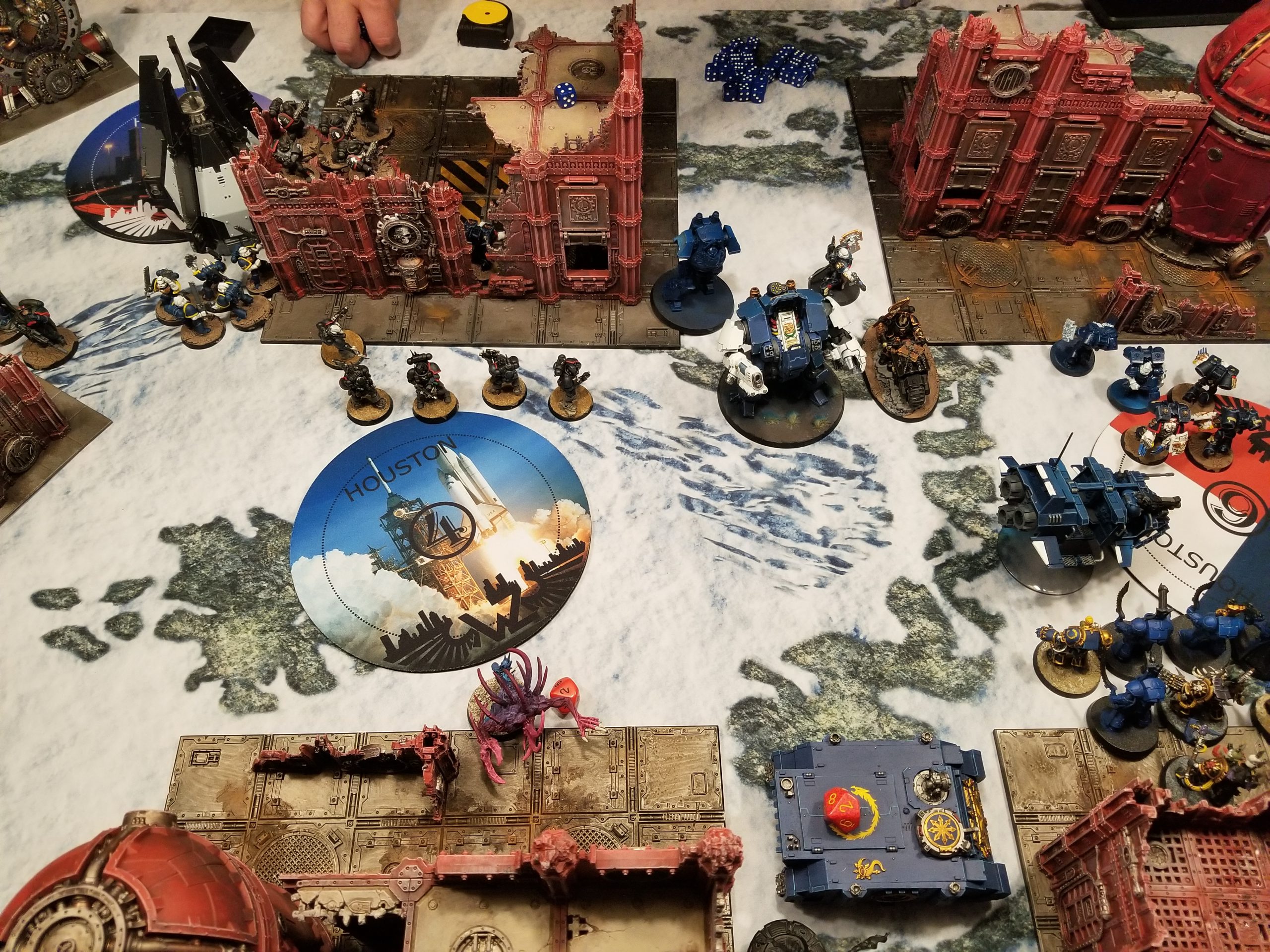 The army is also as difficult to manage mentally as I'd expected, and tracking who had what powers to cast when was incredibly taxing. I need to start thinking about cheat sheets for future games and doing a better job tracking how I'm managing my psychic phase. The psychic phase took forever and I found out that once I cast powers with a character, I forgot who had cast them. I'm going to move to colored sleeves for different casters and potentially just label the backs or color-code them to bases in order to make it easy to remember who has what, though I suspect I'll also need to create multiples of particular cards to handle where I have redundancy. I also just need to get smarter about planning those phases out and how and where I'll need buffs. My plan is to hit up some of the discords I'm in this week and look for advice, and then check out the Hellstorm Wargaming stream of the Goonhammer Open UK matchup of Thousand Sons vs. Sisters for some study on how the army plays. Hopefully one or both of those will prove helpful.