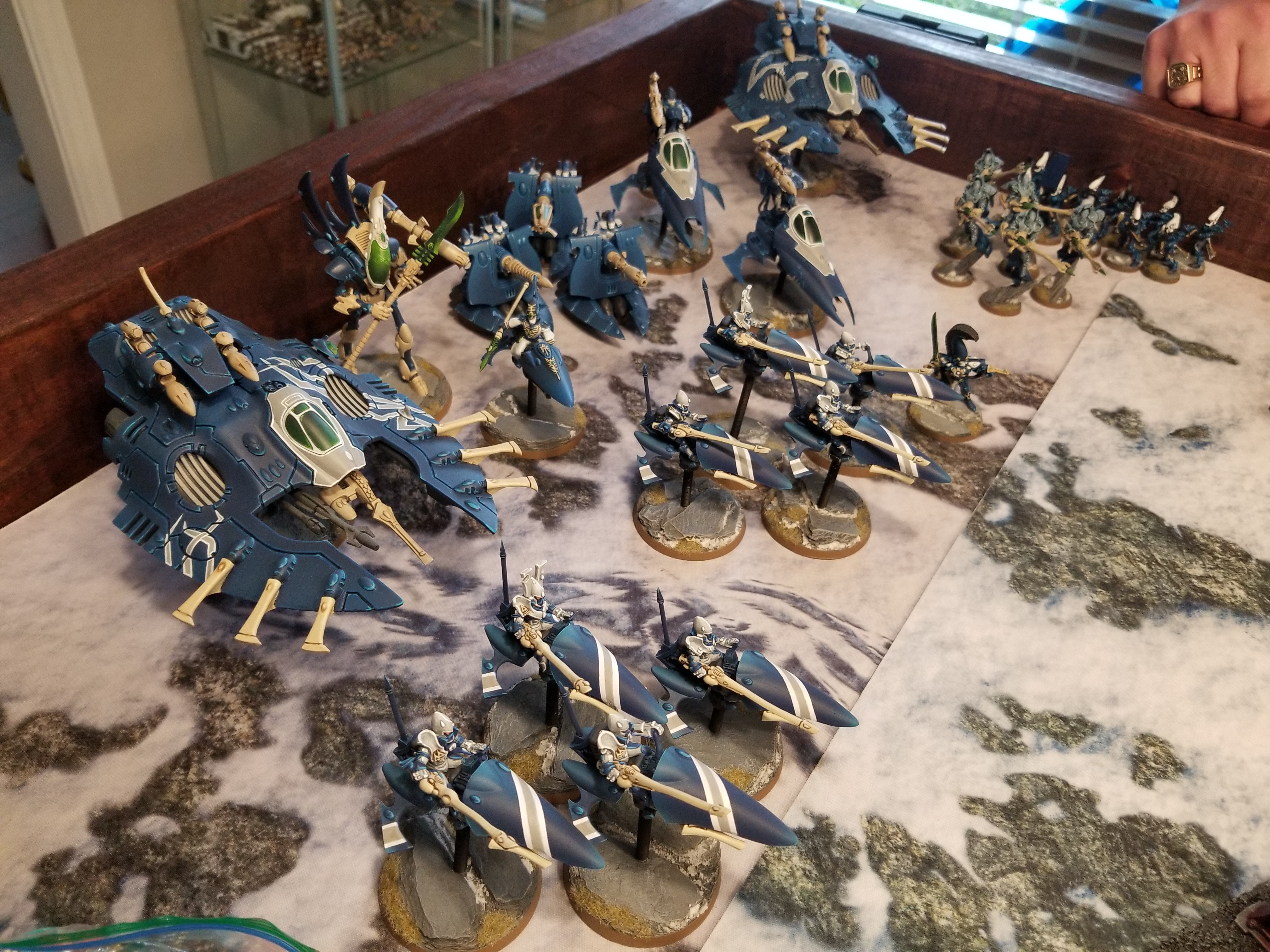 Klobasnek's lovely army, minus the Guardians, who are arriving via the WebwayGreg: I recently finished painting my Shining Spears for the Goonhammer Open, so I decided to take a swing at making a competitive Asuryani list this time. The codex is showing its age badly, but I’ve got a large collection of Craftworlds and should be able to squeeze what little juice there is to be squeezed out of it. With the proliferation of -1 damage, between dreadnoughts, Death Guard, and Ork vehicles, I wanted to give Expert Crafters d-cannons a spin. The smaller table sizes ought to make them more viable than they used to be in 8th. I’m also bringing Asurmen and 20 Dire Avengers in the hope that his 4++ aura lets them stick around on objectives just a little bit longer.