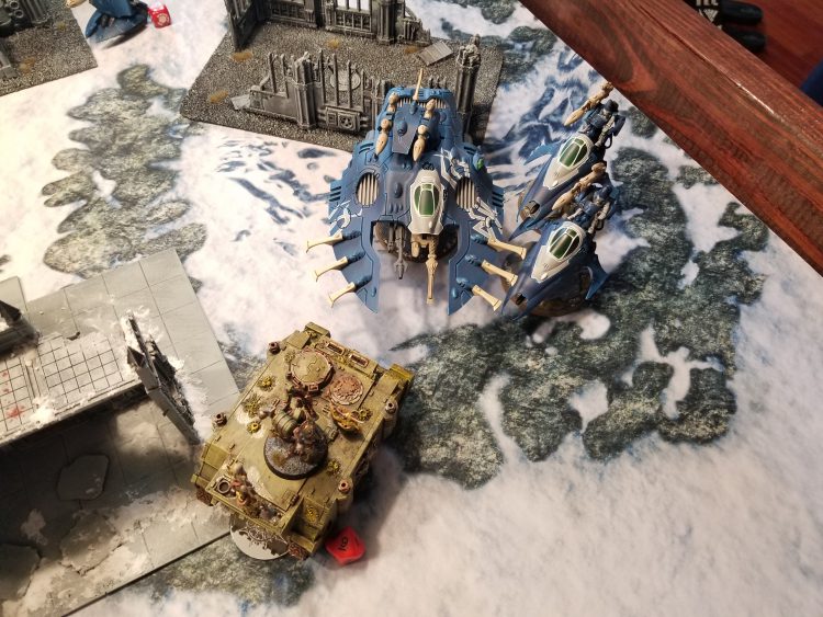 The Rhino touches Greg's Wave Serpent, forcing it to spend CP if it wants to keep shooting.I opt to keep my Plague Marines in their rhino and charge Greg's Wave Serpent in order to force him to spend his CP if he wants to keep shooting with it. He does, and spends the next turn repositioning in order to get to shooting in earnest after it unloads its cargo of a unit of Dire Avengers and Asurmen. His Shadow Spectres drop in just behind his Wraithseer, but I've done a good job screening out his Guardians so far so they hold back another turn.