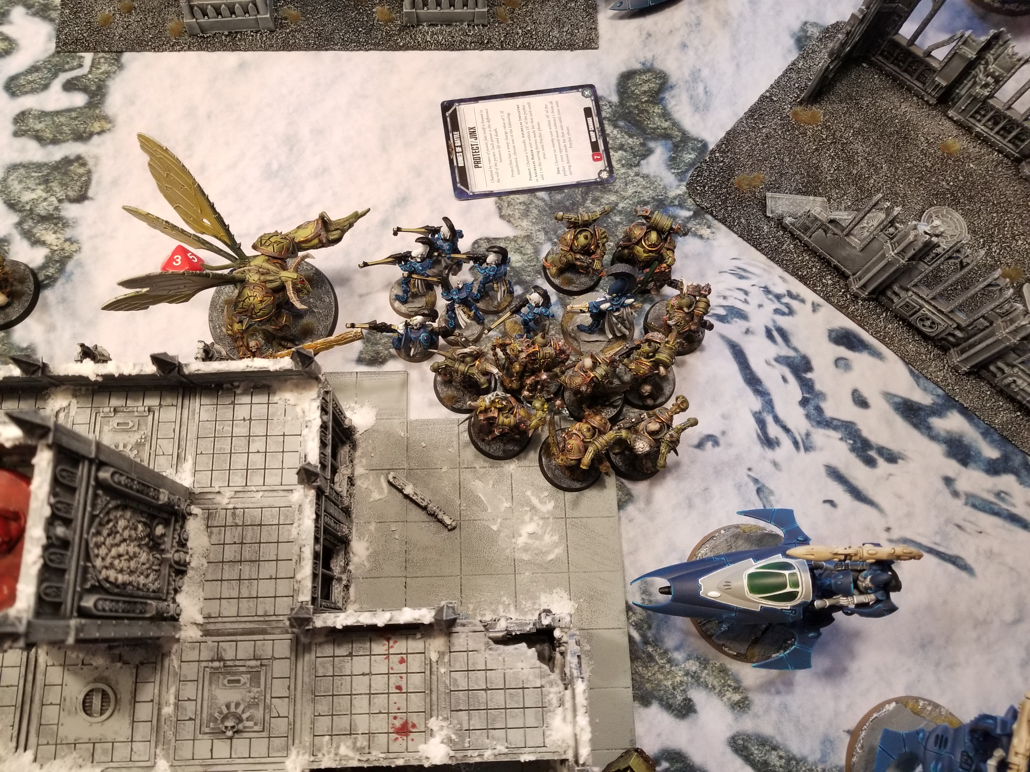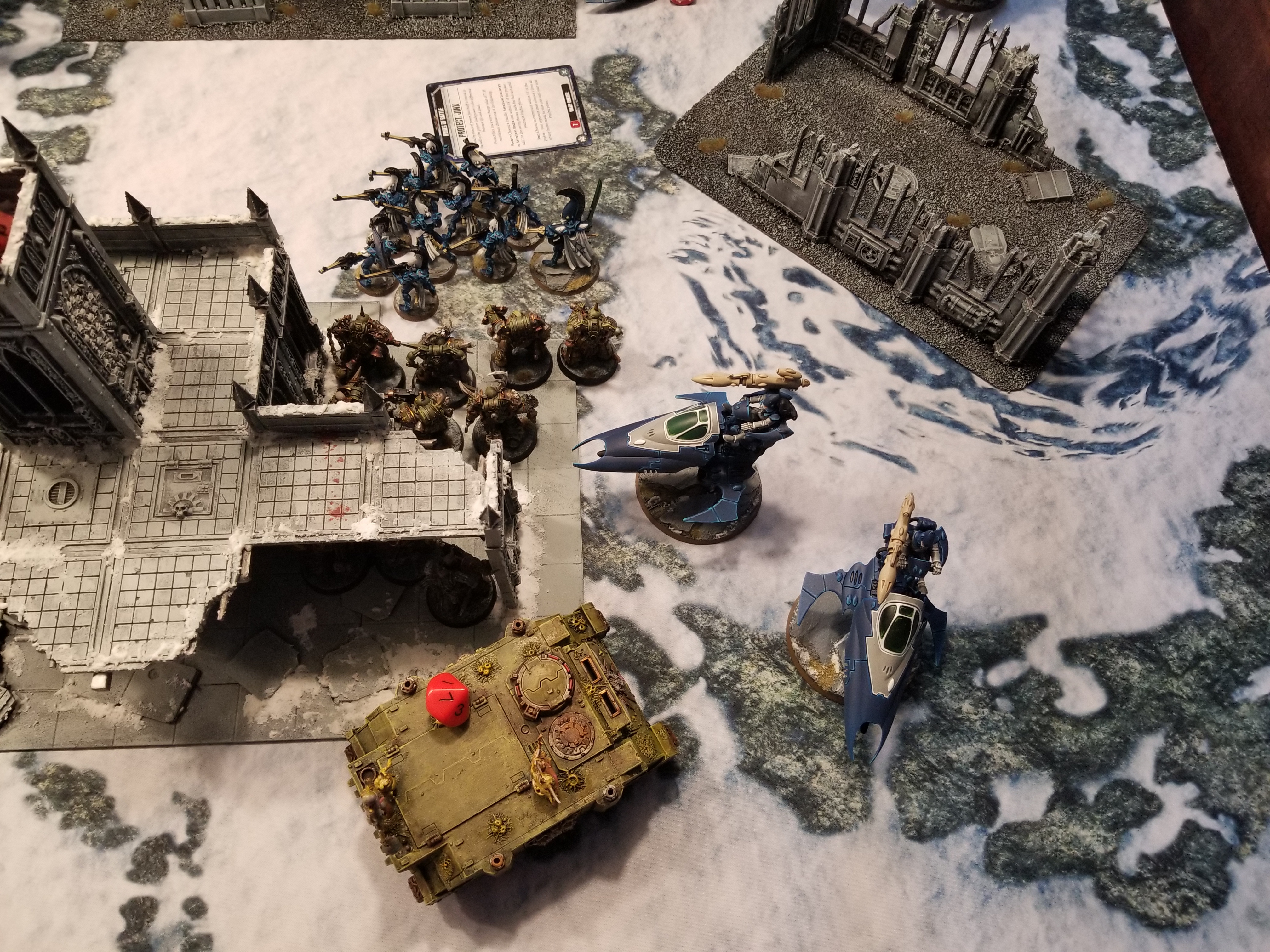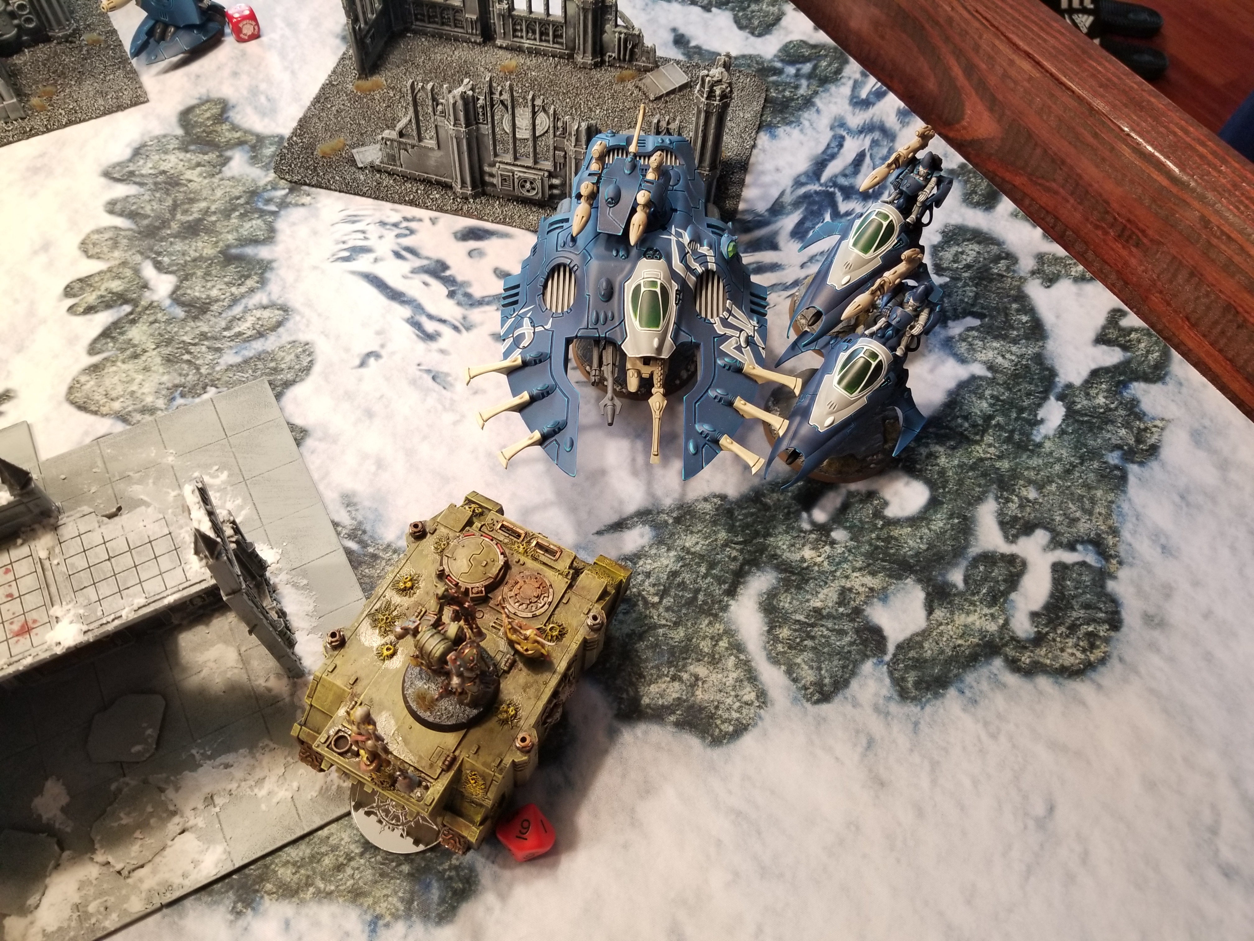 Buddy, this is a no-parking zone.At mid-table Greg pulls up with the Wraithseer and drives his other Wave Serpent to mid table, using it to bock my advance and using it to prevent me from scoring the mid-table objective on my turn. This means I'm not going to have hold more, and after he shoots my poxwalkers to death, I'm only holding two. He completes the trifecta by charging his Vypers into my Rhino after they shoot, putting both within 3" of the objective and putting me on only holding 1 when my turns rolls around. The Blightlords endure a rough round of shooting from the Spectres and D-cannon platforms, and end up losing 5 models in the process. I'll spend 2 CP on my turn to ensure they don't have to worry about fleeing. Greg opens the turn with 5 points on primary and he's scored 2 on each of turns 1 and 2 with Engage on All Fronts so now he's up 10-3.
