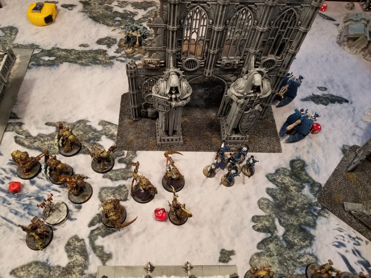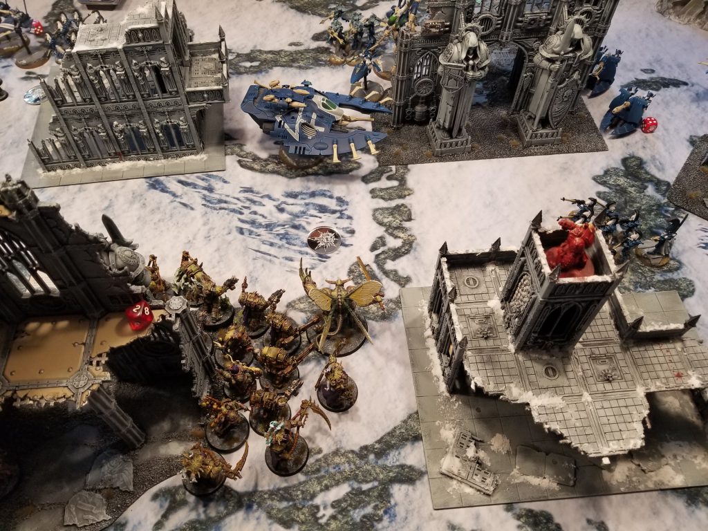 that poor DP is not long for this worldAnd that's exactly what happened. Garrett changed up the tide to get extra damage on his Nemesis force weapons, then proceeded to murder my poor bloat-drone and dropped half a dozen mortal wounds on the Daemon Prince to kill it. Draigo started to wheel around here, and made an earnest attempt at killing my Deathshrouds, while using Gate to toss another strike squad to my northwest corner. The Blightlords killed that one too, with a little help from the Plaguecaster, who managed to fire off 3 mortal wounds at them with Curse of the Leper. On the Dreadknight side of things, his Dreadknight charged both of my Crawlers, taking them out of the game for a turn and dropping one to 5 wounds.