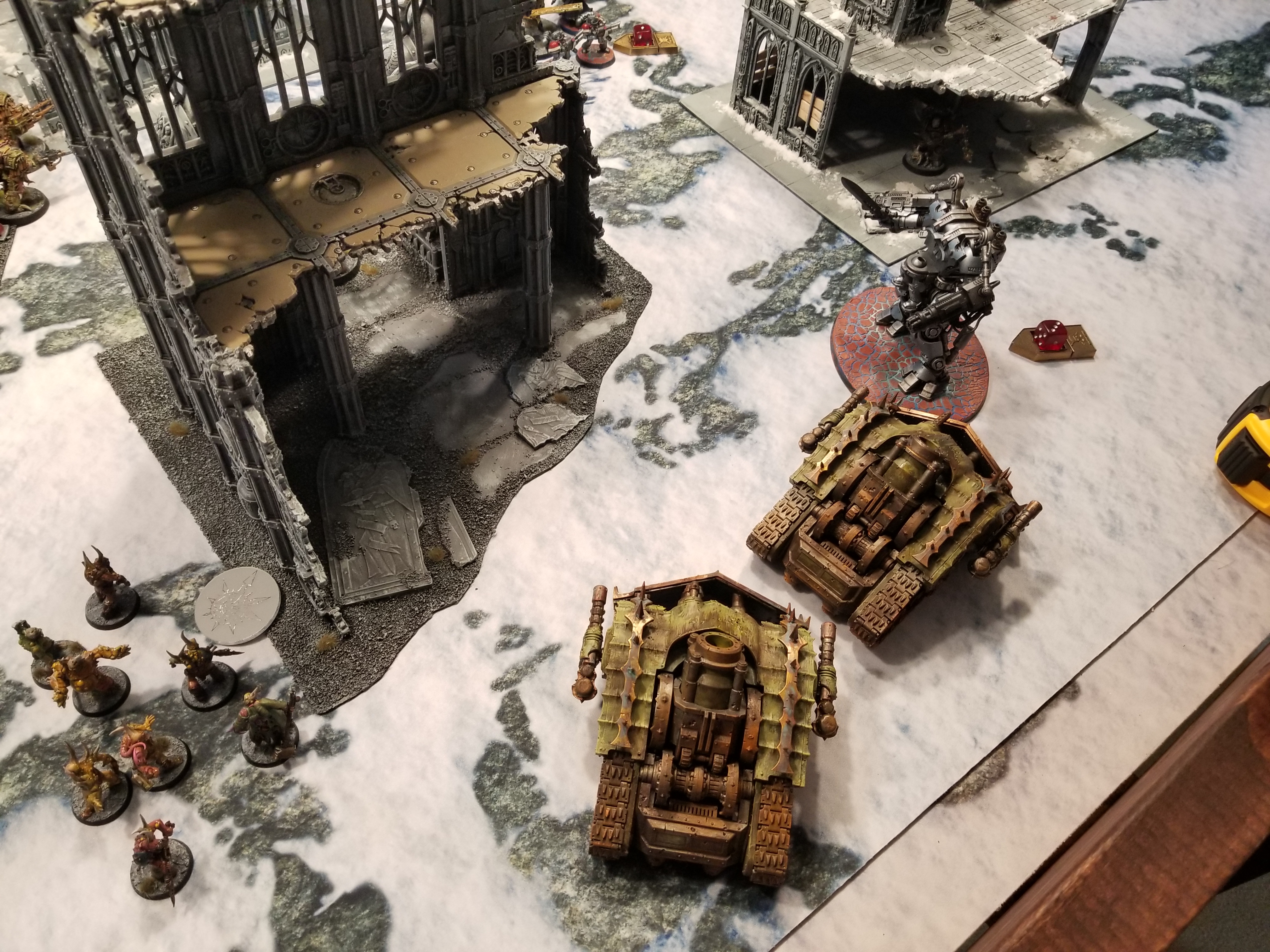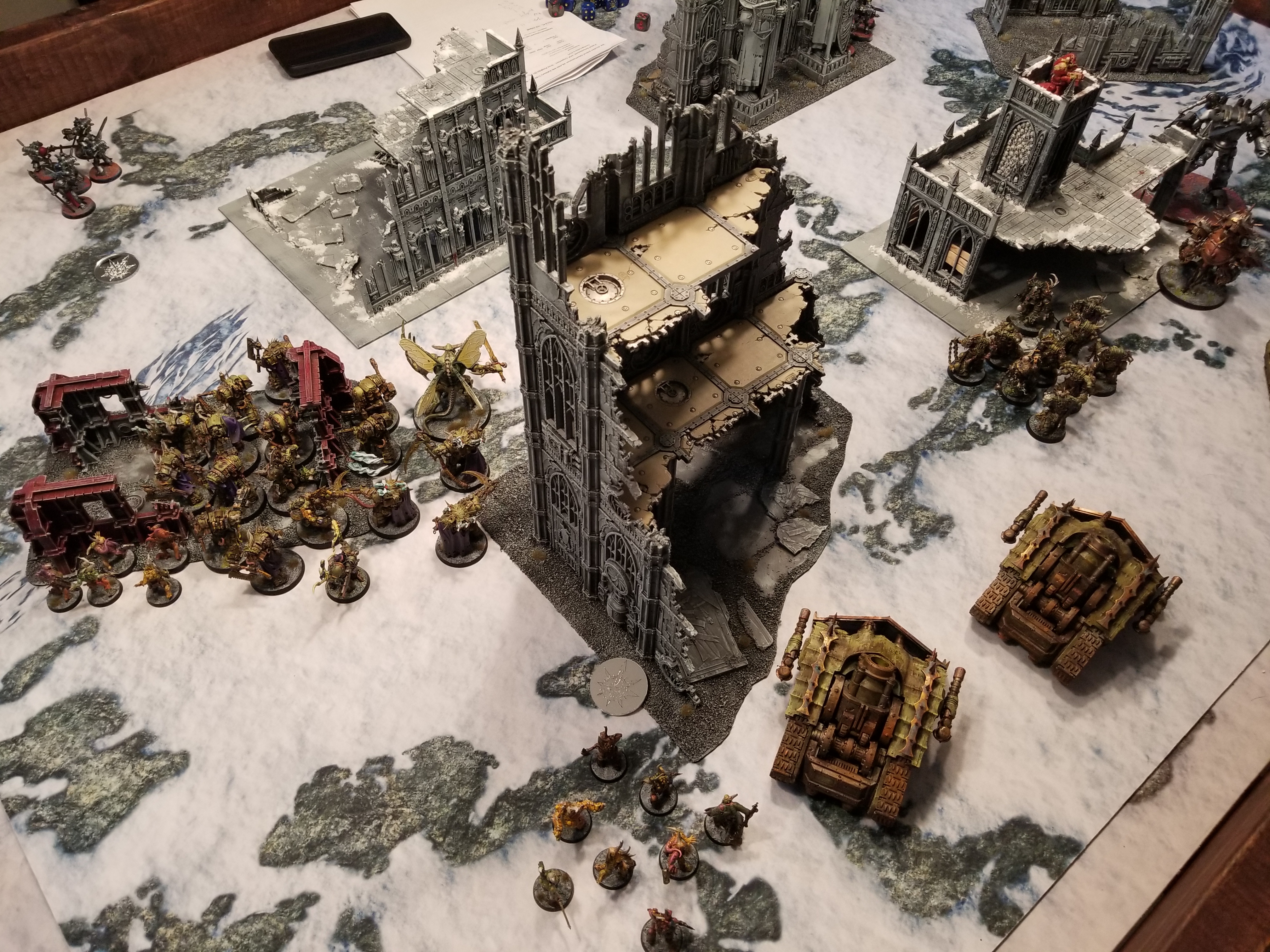 Dumpsterbots, ROLL OUTMy general movement plan is to head north with my death star blob and wheel around, spreading the sickness as I go to ensure I get 9-12 points for it. As I push forward I keep my units spaced to screen out deep strikers - the Paladins have been held in reserve and I need to watch for them. I activate Flash Outbreak on my bloat drone in the command phase - this gives it Gloaming Bloat for a turn and ups its contagion range by a battle round, so now enemy units fighting it don't get re-rolls to hit or wound. That will be important soon. Primarily through weight of fire, my Blightlords are able to wipe the strike squad off the northwestern objective, while the PBCs take out one of the two dreadnoughts and a couple more marines. The Fleshmower charges the Dreadknight, drops it to 3 wounds, and takes several back, but thanks to that no re-rolls rider, it's able to survive with 4 remaining.