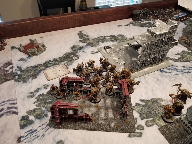 Grind Them Down is my go-to in games against pointy-eared armies, as I know they're capable of killing key targets but not necessarily capable of out-killing my army on a given turn. Sweep and Clear is the perfect mission for my army and Direct Assault is basically tailor-made for what I want to do, which is quickly move to the middle of the table and hold the center objective for the bulk of the game. Neither Assassination nor Bring It Down is a good pick against Klobasnek's army, and I don't like Spread the Sickness on this map since there are only five objectives and they're all pretty far apart, so that leaves psychic secondaries I'm not really equipped to handle and will likely be denied, or action secondaries I'm not super well-equipped to score. In these cases however Raise the Banners High is an adequate tertiary option - it can be performed by characters, and so the Tallyman and Putrifier are perfect models for doing this - the former doesn't have much to do after the Command Phase and the latter can still safely use his infusion ability while performing an action.
