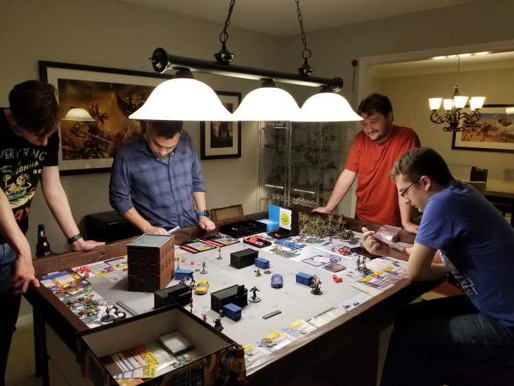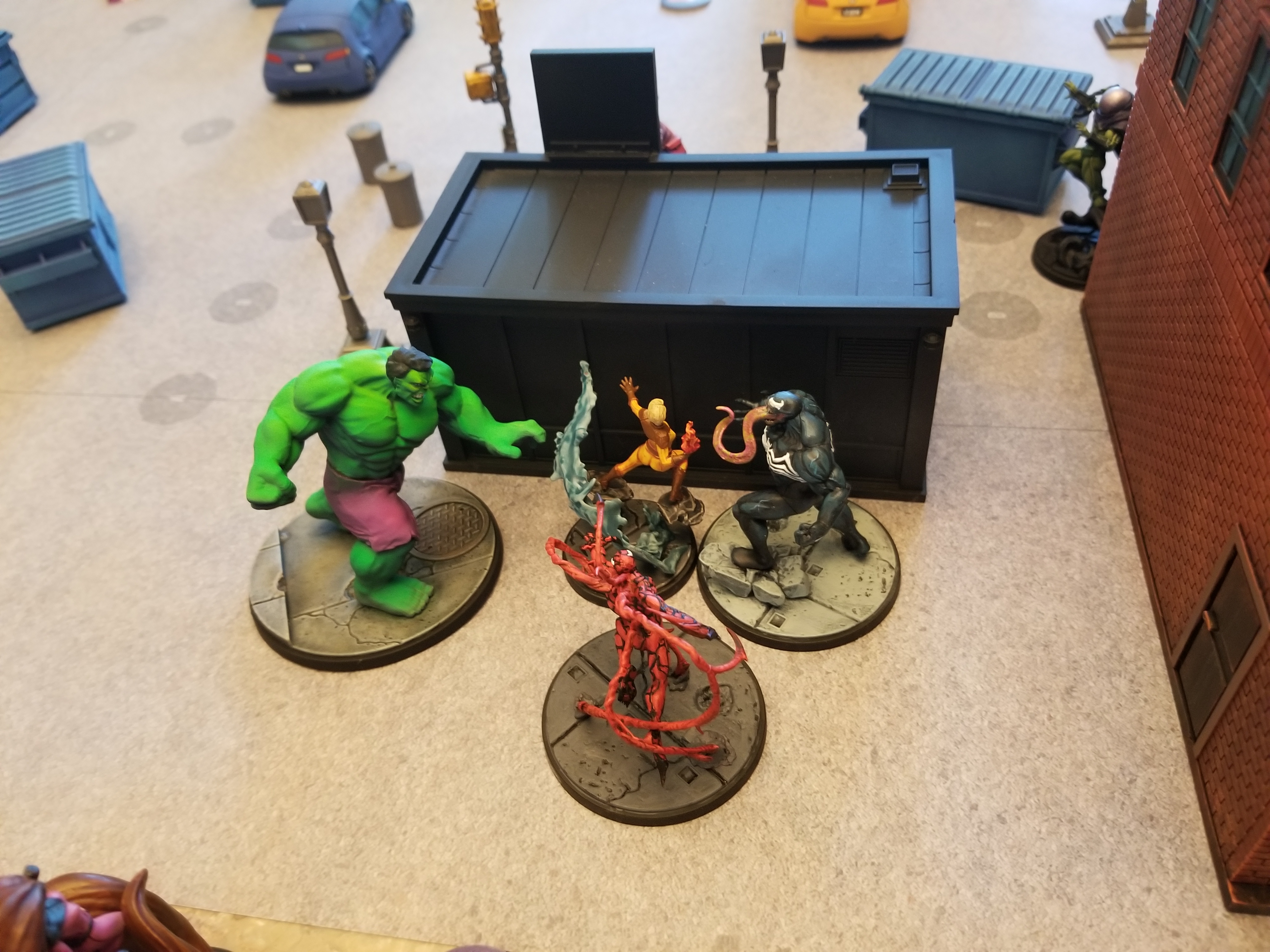 Crystal, Venom, and Carnage take on the Hulk. Credit: Robert "TheChirurgeon" JonesI ended up playing four games: Two one-on-one against Garrett (I won both), an event 2v1 with Garrett against Alfredo's Hulk that we lost, and a four player free-for-all Separation Anxiety event that I ended up winning. All said I had a blast and I'm looking forward to playing more games of Crisis Protocol in the future. There are a ton of great models in that range (though Carnage is a bit hateful to assemble and paint and transport), and the game itself is both very fun and tactically deep. Plus the terrain is great and I love those kits.