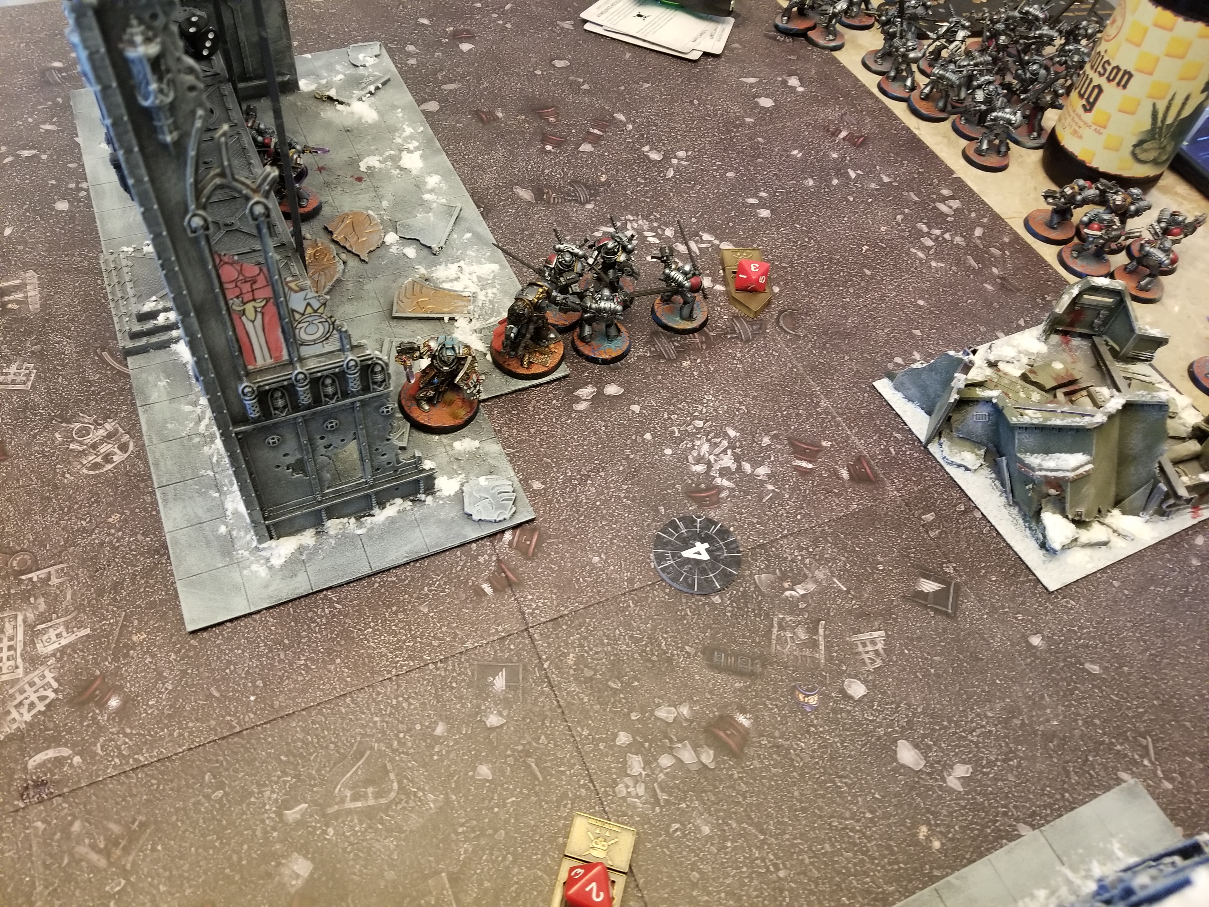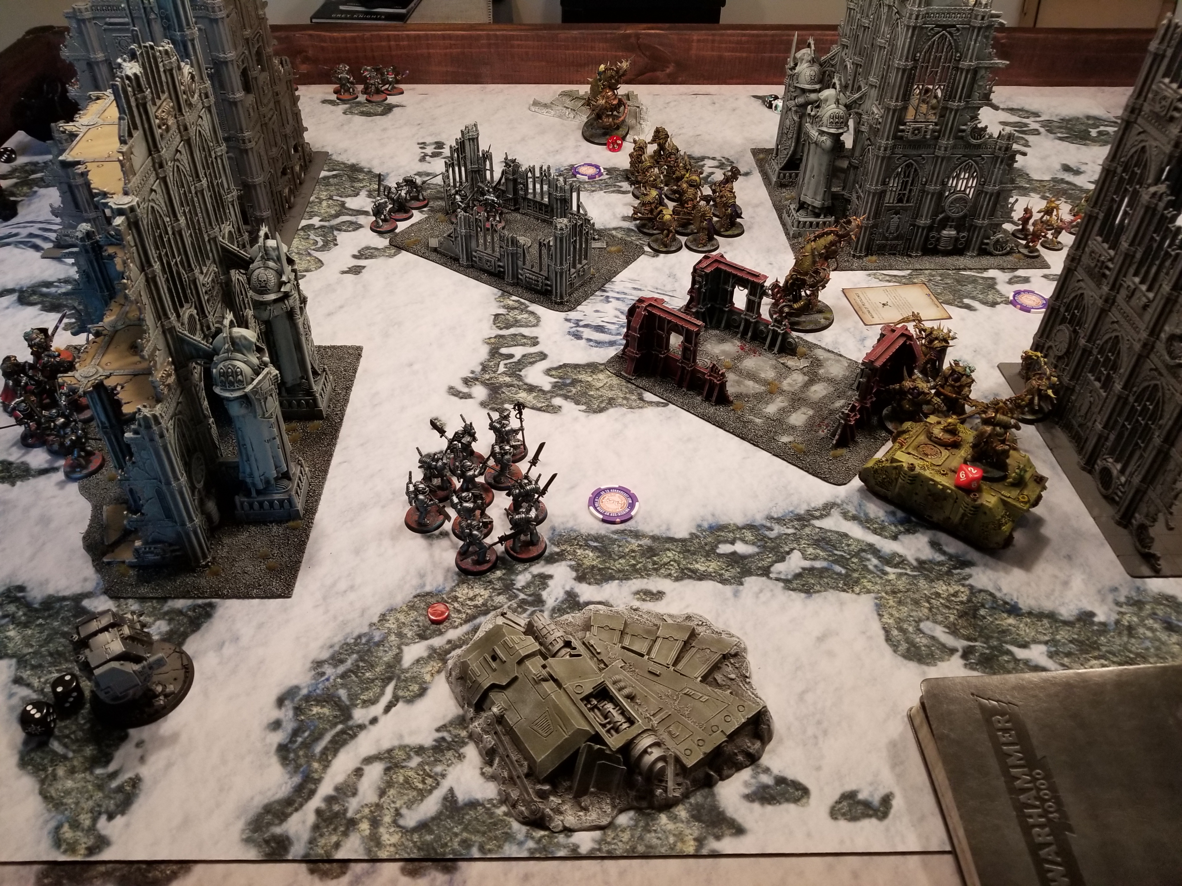 Battle Lines, game 1 vs. Grey Knights. We're playing as though the center ruins are flat, and trying as best we can to mimic the GW terrain layout.My Secondary Objectives