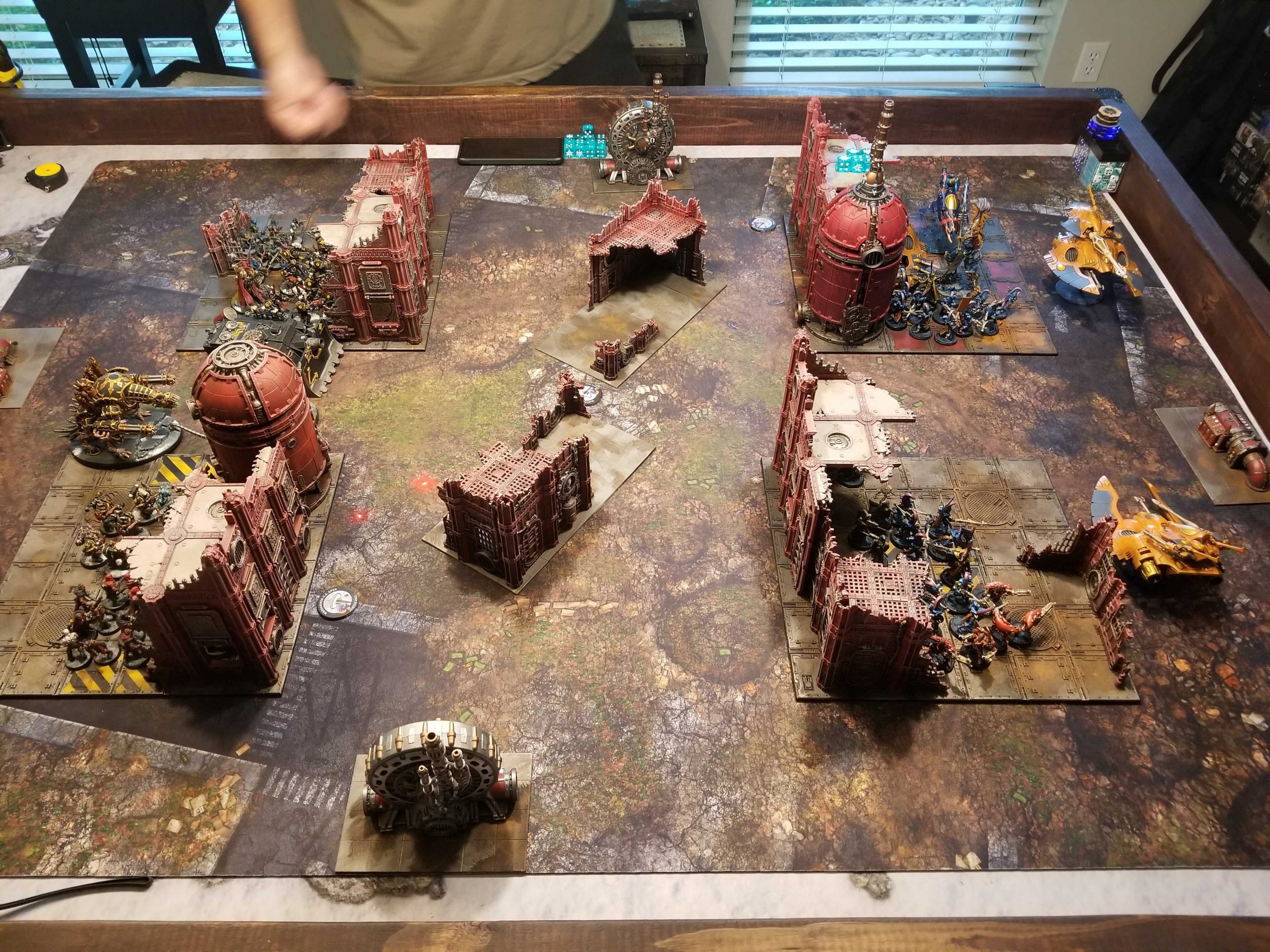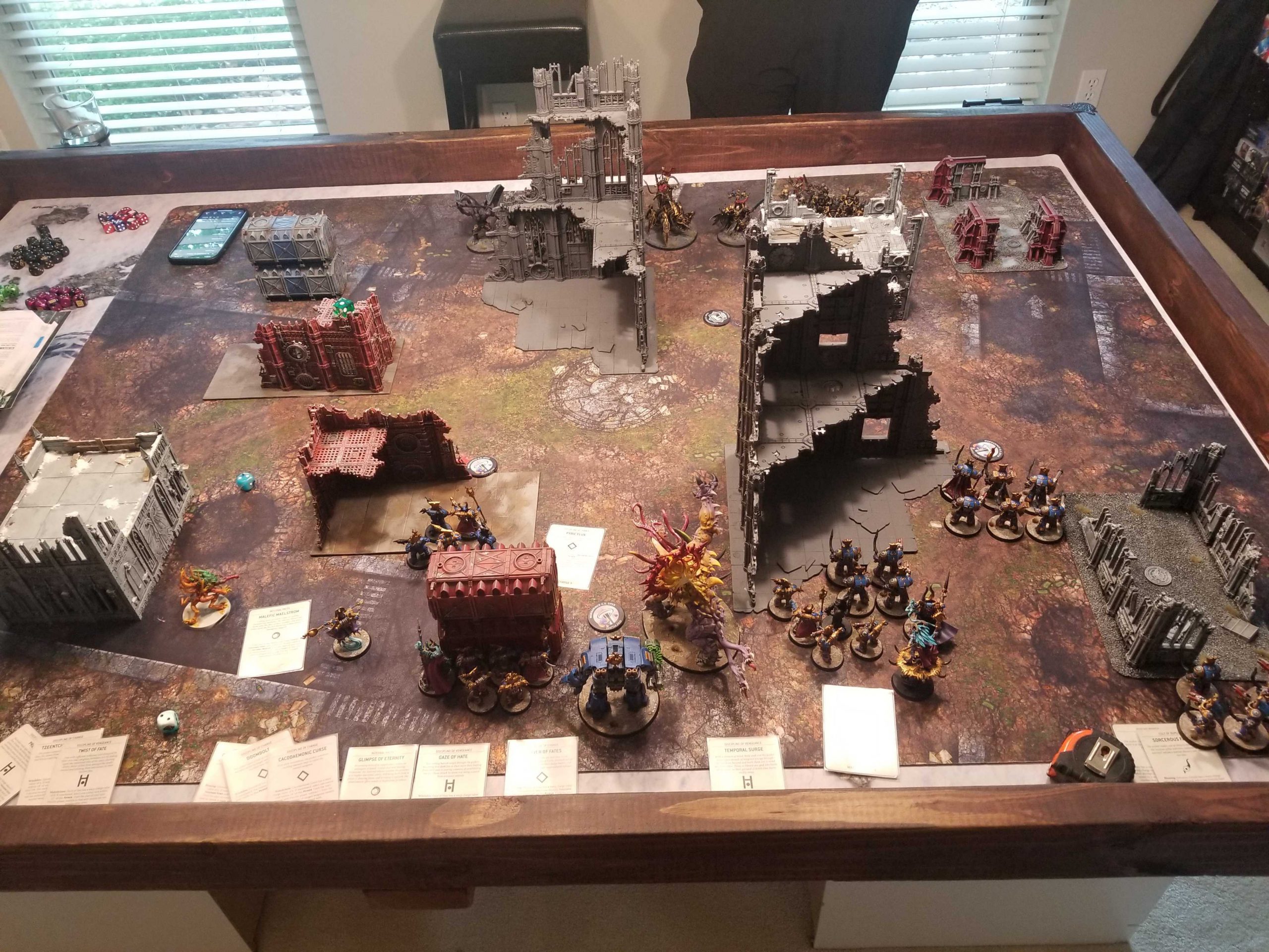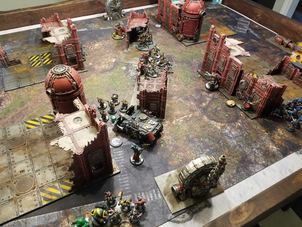 Squaring up against Chaos Knights againSo I got in another game against Dan's Chaos Knights. Dan's usually good for the occasional weekday game and that's super helpful. I even offered to feed the guy. This time around we were playing Recover the Relics and I won the first turn roll-off. I then proceeded to try and tell Dan he could go first anyways, but he also wanted to practice going second. This game was kind of hilarious - Magnus dropped in and killed two war dogs T1, which then promptly exploded (Dan's units explode 80% of the time at my house), doing some mortals to the Despoiler. Then the Despoiler and the Abominant shot him off the table.