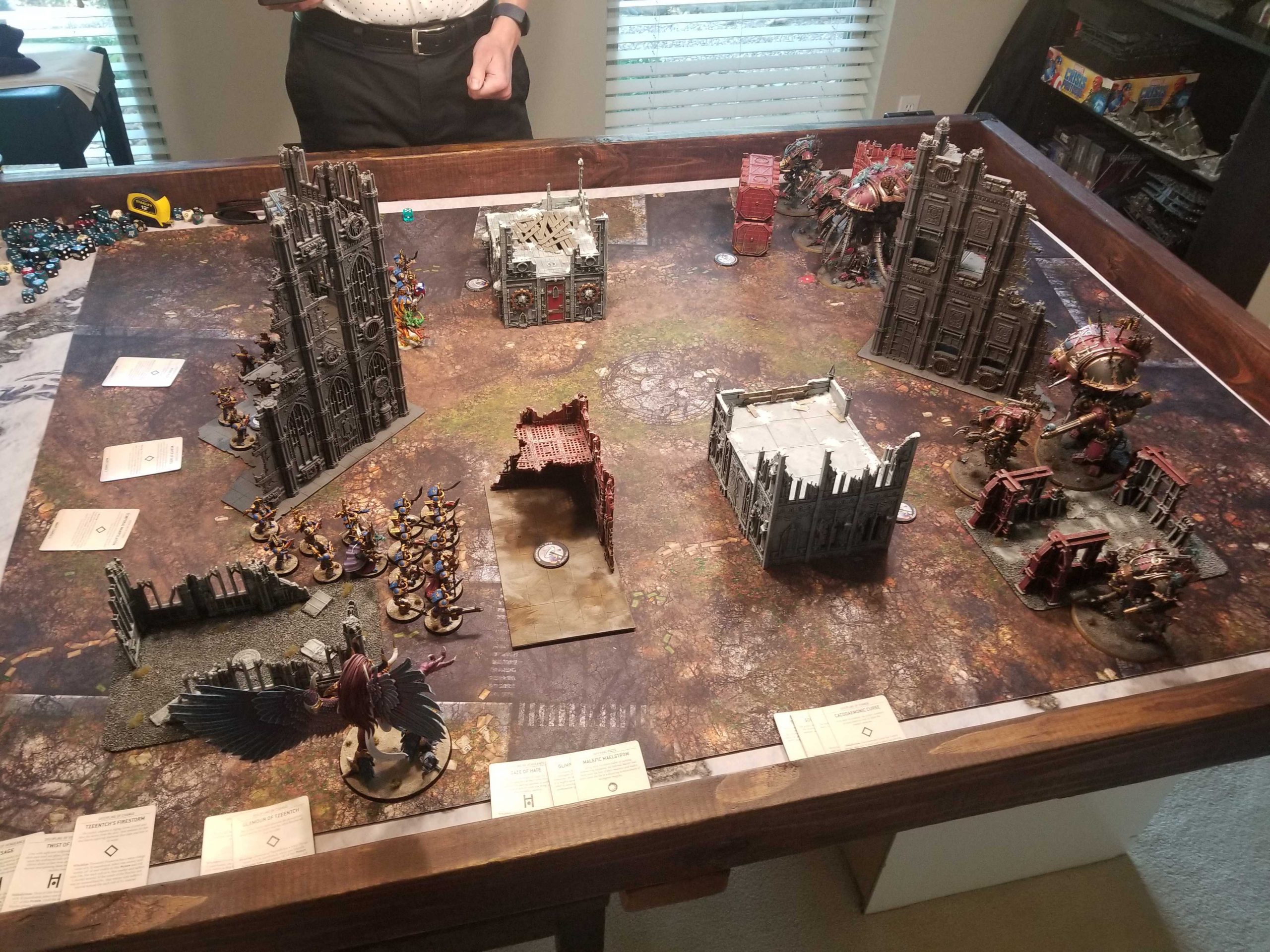 Building a Thousand Sons list these days generally goes one way: You start with 20 Scarab Terminators, 3 units of Rubrics, an Infernal Master and two of Ahriman/Exalted Sorcerer/Daemon Prince. That leaves you with about 500 points to spend, so the question is how you're going to fill those out. My initial goal was to try and plug that hole with something I'd already painted. At first, I thought I'd try Magnus. Magnus is a big threat and while you can't hide him, he's a value add in some matchups, like Tyranids, Custodes, and other Thousand Sons. his ability to just completely shithouse things with mortal wounds is a big bonus, and he's a capable melee threat. But in some matchups he'll just get instantly and immediately vaporized and that's an issue.Game 3: vs. Dan's Chaos Knights