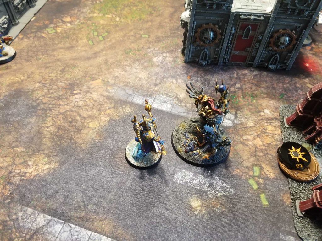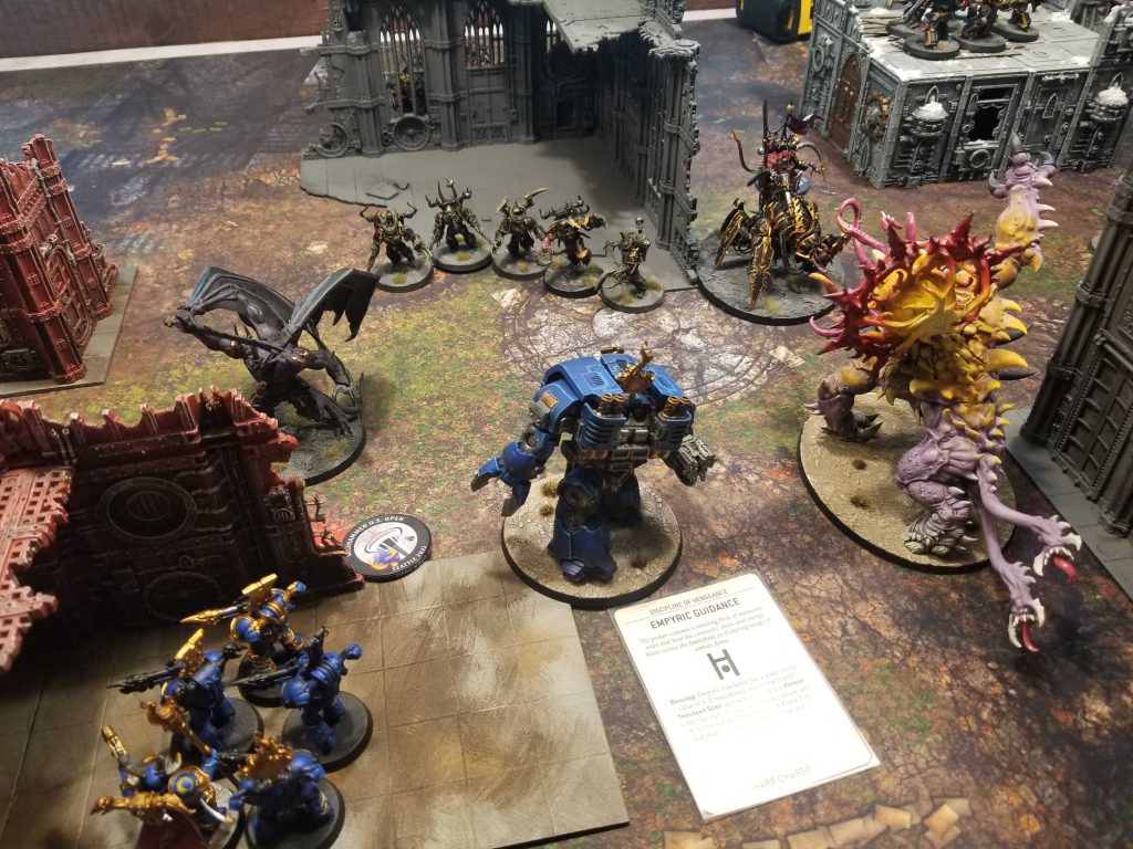 ill-fated one-on-one combatI end up having to spend a smite cast with my Terminators, which keeps them from being able to double move and charge Abaddon. This leaves them with a 9" charge, but I've got Glimpse of Eternity to help make that one easier with a re-roll one/both. I get Abaddon down to 3 wounds, then fail that charge, scoring only an 8. As my Exalted Sorcerer was unable to get out of Intervention range, he makes the charge in a last-ditch attempt to get through a single wound. He does not. Abaddon easily kills the Sorcerer and moves on. He'll die next turn when my Tzaangor Shaman survives his attacks and pops him on the noggin with a force staff.
