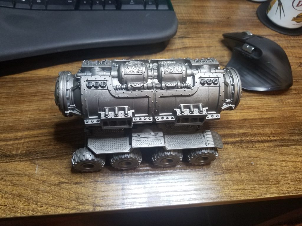 On top of that, I'm painting two Ridgehaulers for a special mission during the campaign in which players attempt to hit the supply lines of one of the defenders. I want one of the Ridgehaulers to be carrying a tank of some kind (instead of just another crate), which meant making one. Fortunately, I have a couple of mechanicus incinerators lying around from Kill Team Nachmund that I can use for this. I can just saw these in half and stitch them back together.