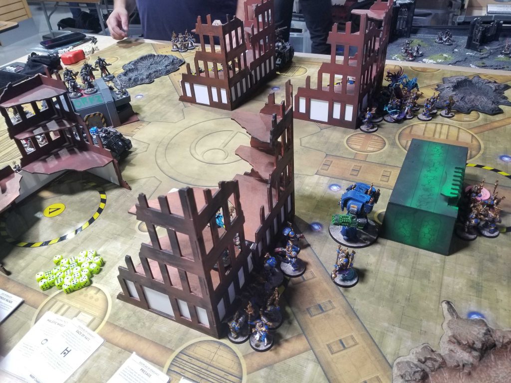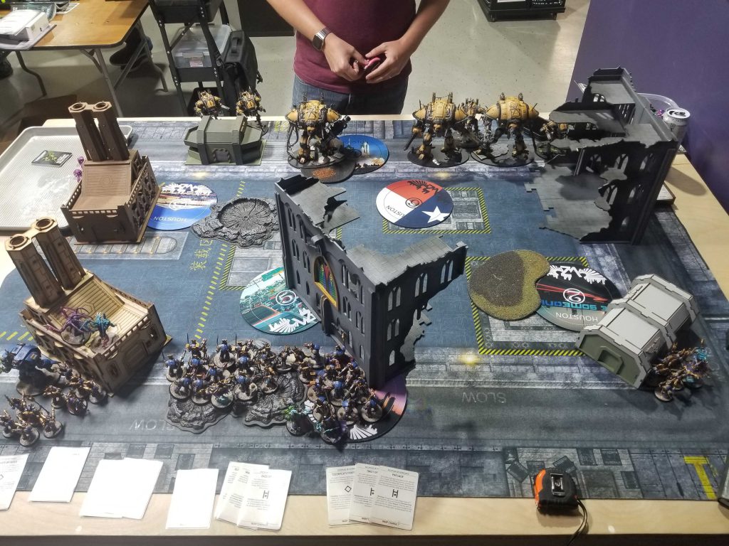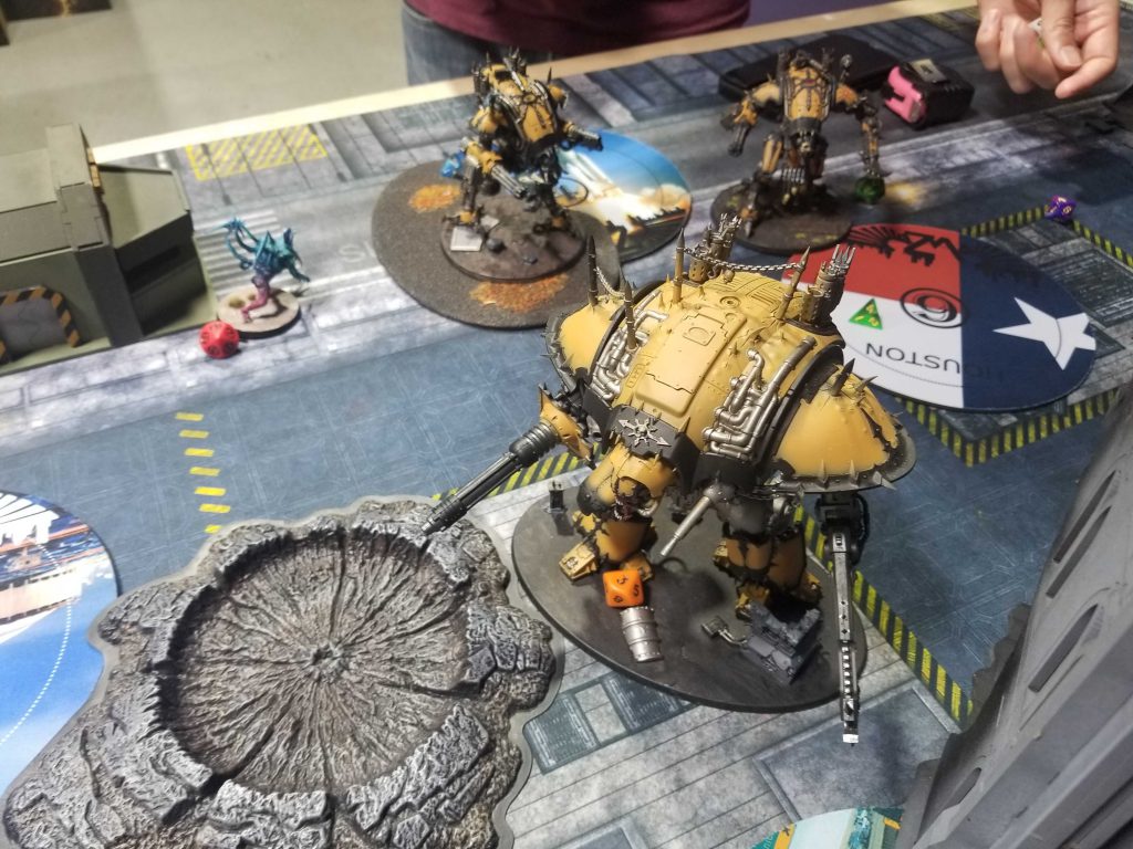 Round 1 vs. Chaos KnightsT's an Asgard regular I've just never really played. While he's still getting up to speed on the game, he's a solid player and rapidly improving. His list is ironically a better match for mine than most Chaos Knights lists - normally I make quick work of these lists by killing off the war dogs early and ignoring the one big knight, but in this case T has three big knights - an off-meta choice that makes it much harder for me to take out individual knights, particularly as he sits back and shoots me with his War Dogs.