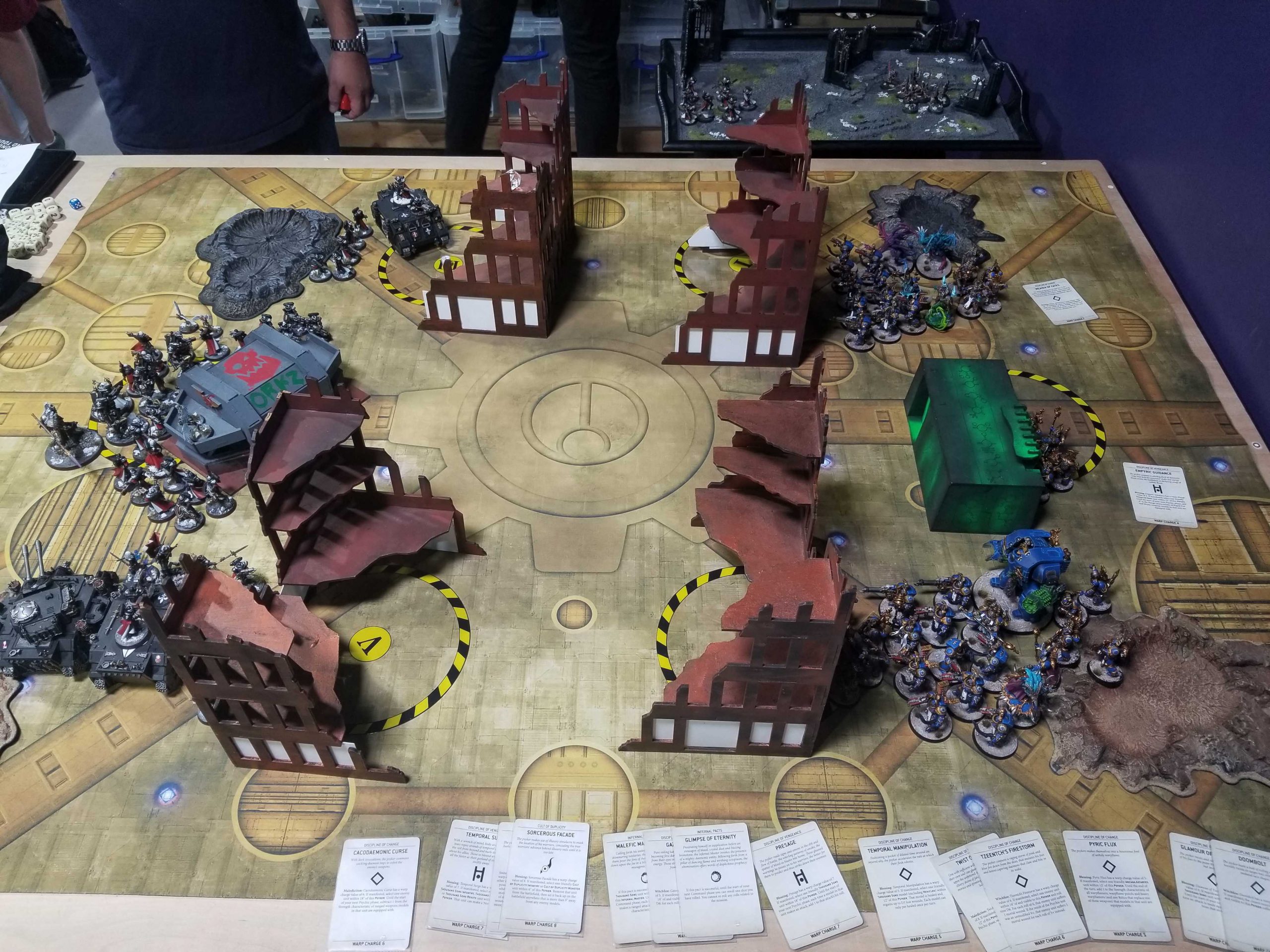 One quick thing to note on the event before we get started, though: This particular event was using player-placed terrain, which will account for some of the layouts you see in the photos below. This was a net negative for me overall, since my army thrives on medium lines of visibility and isn't particularly interested in digging into melee. There were also magic box terrain features in play, which are generally very bad for my army.
