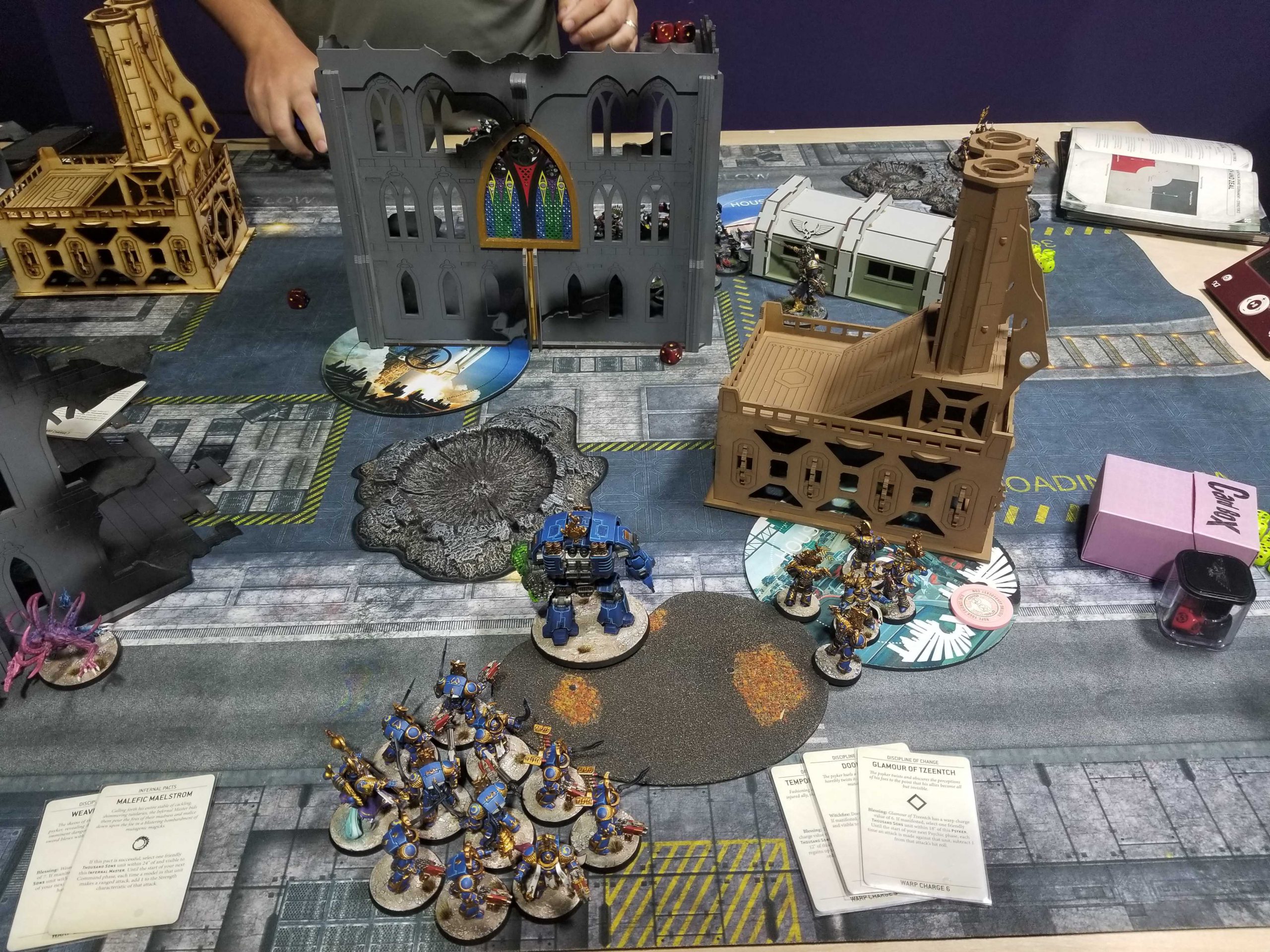With the Ultras experience and another 2-1 finish (albeit LWW) behind me, it was time to go back to Chaos. Unfortunately, I'm still very far away from having a painted Black Legion army in place for my next GT - Warzone Houston - and I need to get more practice in with my Thousand Sons before I go to that event; it's been a bit too long since I played them and they're not an army with a light mental load. The good news is that a spot opened up for an RTT at Ettin games, and I was able to slip in for another 3-round event with only two weeks to go until WZH. Normally I'd have been at NOVA this weekend, but I decided against it after thinking about the stress of traveling for an event every other weekend for 8 straight weeks (LSO > GHO > NOVA > WZH, plus I was considering the LGT in there too!). This was a much more workable compromise and won me some Wife Points(tm).