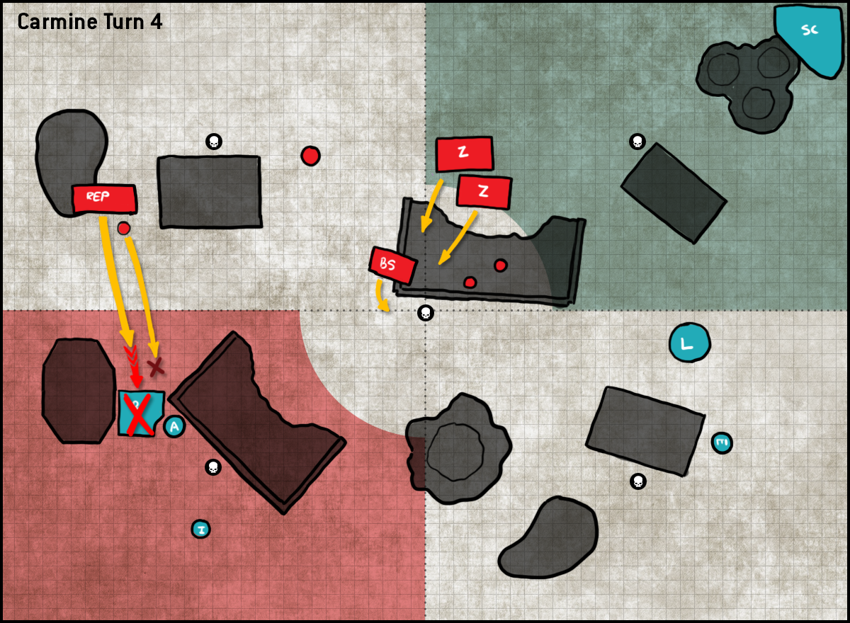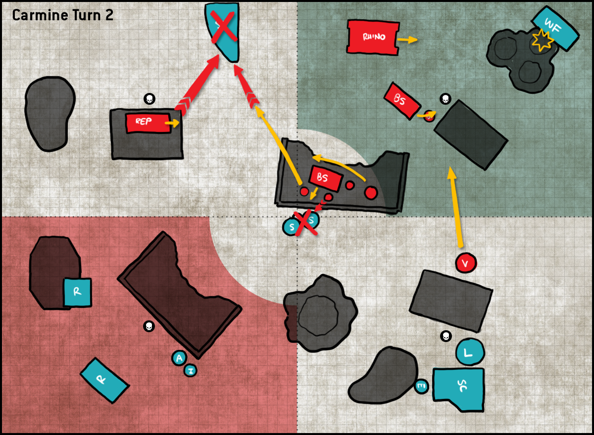 FINALLY. I legitimately want that here - Carmine has deployed waaaay too aggressively, leaving his entire backfield open and several key lines of sight on the right side.NOTE: Some things might not line up here 100%, but chalk that up to my memory of the game being less than 100% perfect. I've got notes on the scores but only a couple of photos and generally I'm less clear on exactly which of Carmine's units I killed when - partly because they mostly sat in a big blob in the middle of the table - so mostly I only how I scored as a result.