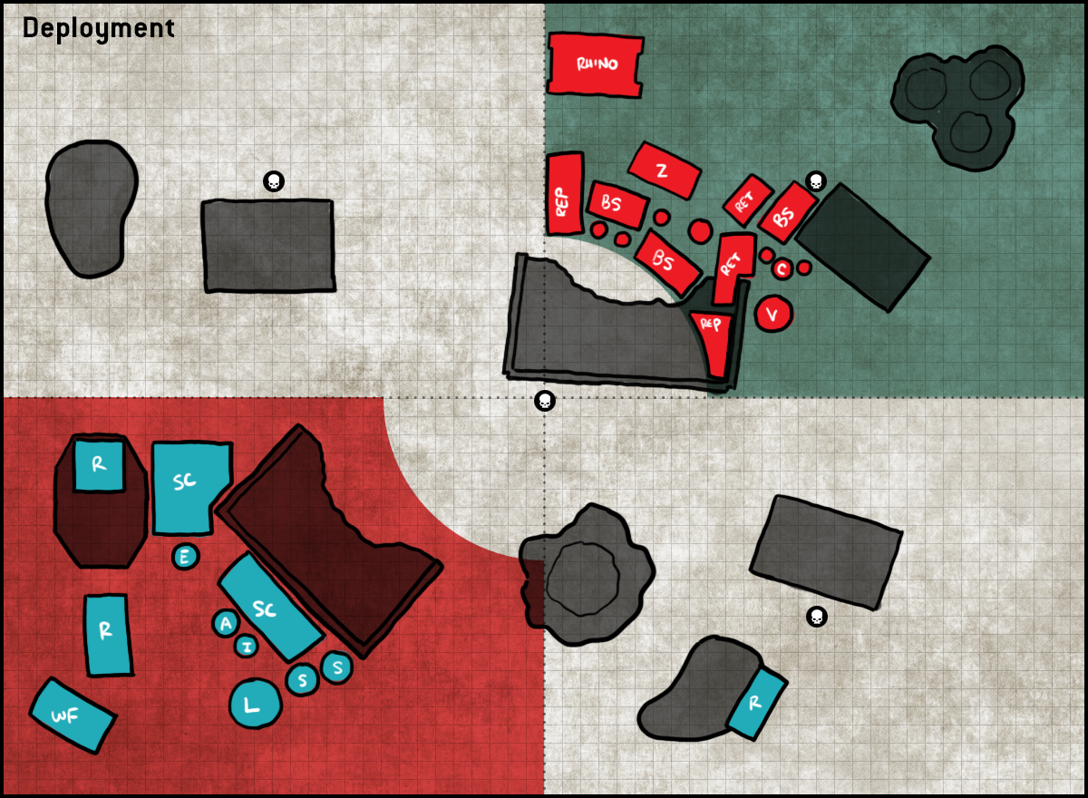 A. Carmine dropped his first piece of terrain here. His plan was to use this to screen his advance, so he could charge forward with Repentia without getting overwatched if I dropped too close in.