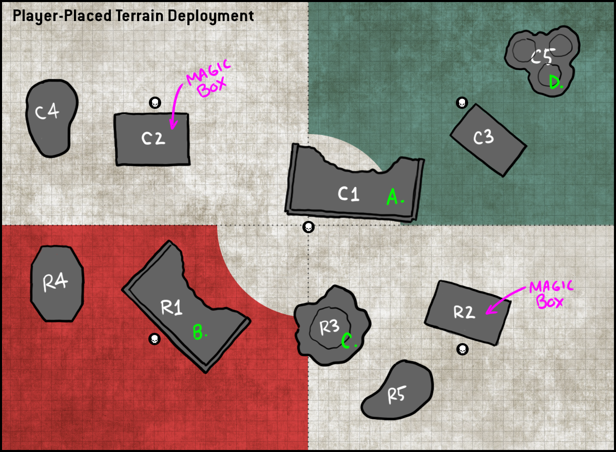 - A medium-sized ruin that acts as a "magic box," i.e. units can move inside it and can't be seen while inside, nor can they see out
