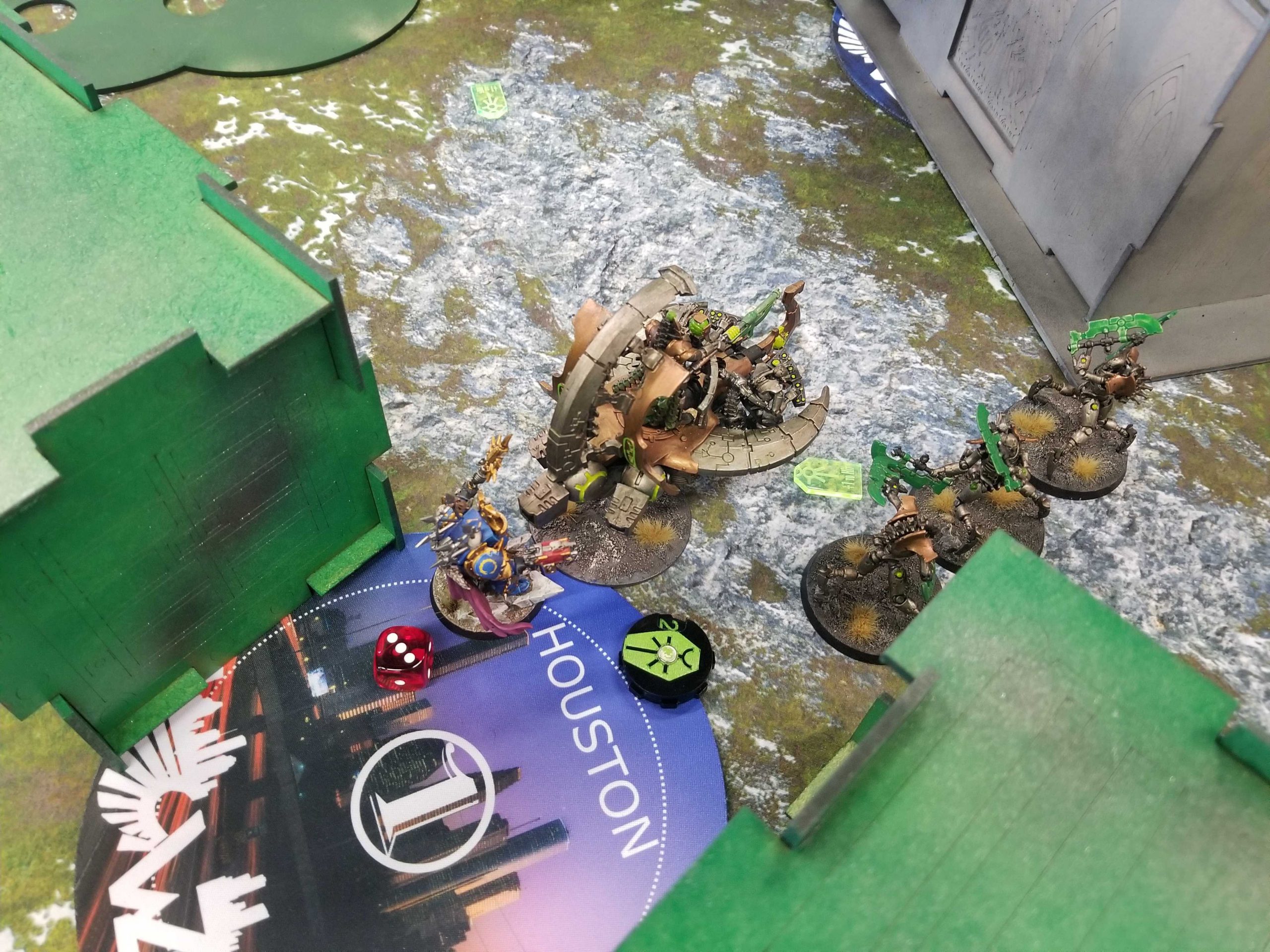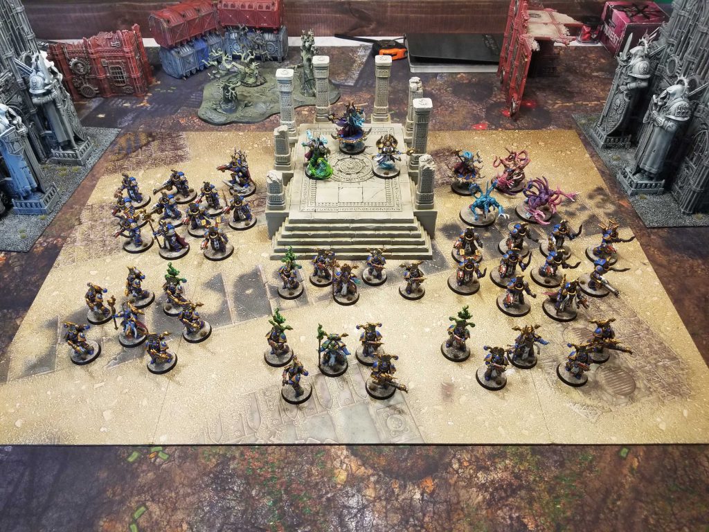 Photo Credit: Robert "TheChirurgeon" JonesI deploy conservatively and use my pregame redeploy to shift my terminators to the north side of the table. Dane uses his first turn to put a unit of Scarabs on the center objective and I'll spend the next few turns clearing off the middle objective while Dane keeps moving units onto it. It takes me a few turns to get a foothold in Dane's territory so I don't start scoring Engage until round 3, but I'm able to keep Dane off Ancient Machineries most of the game.