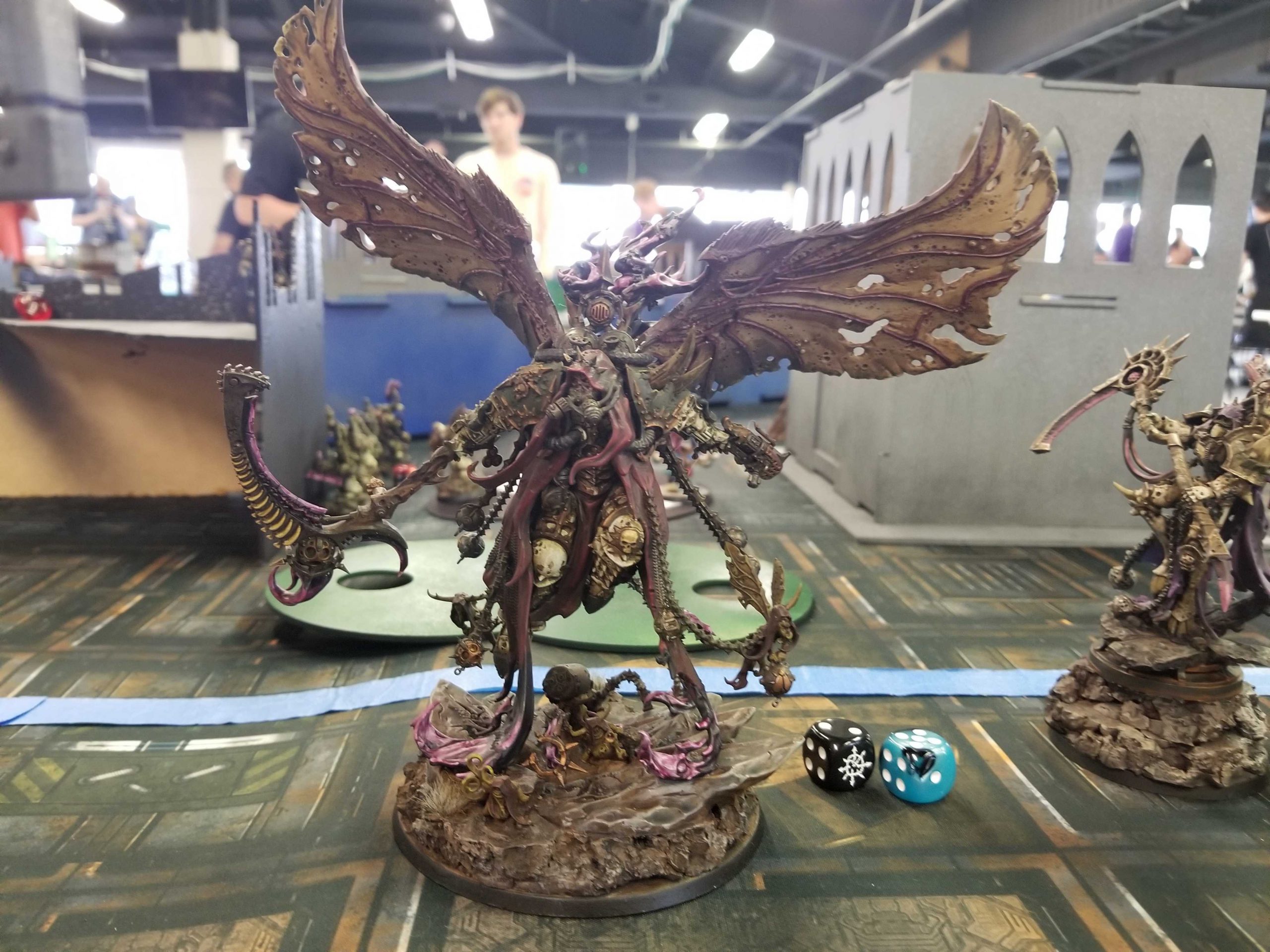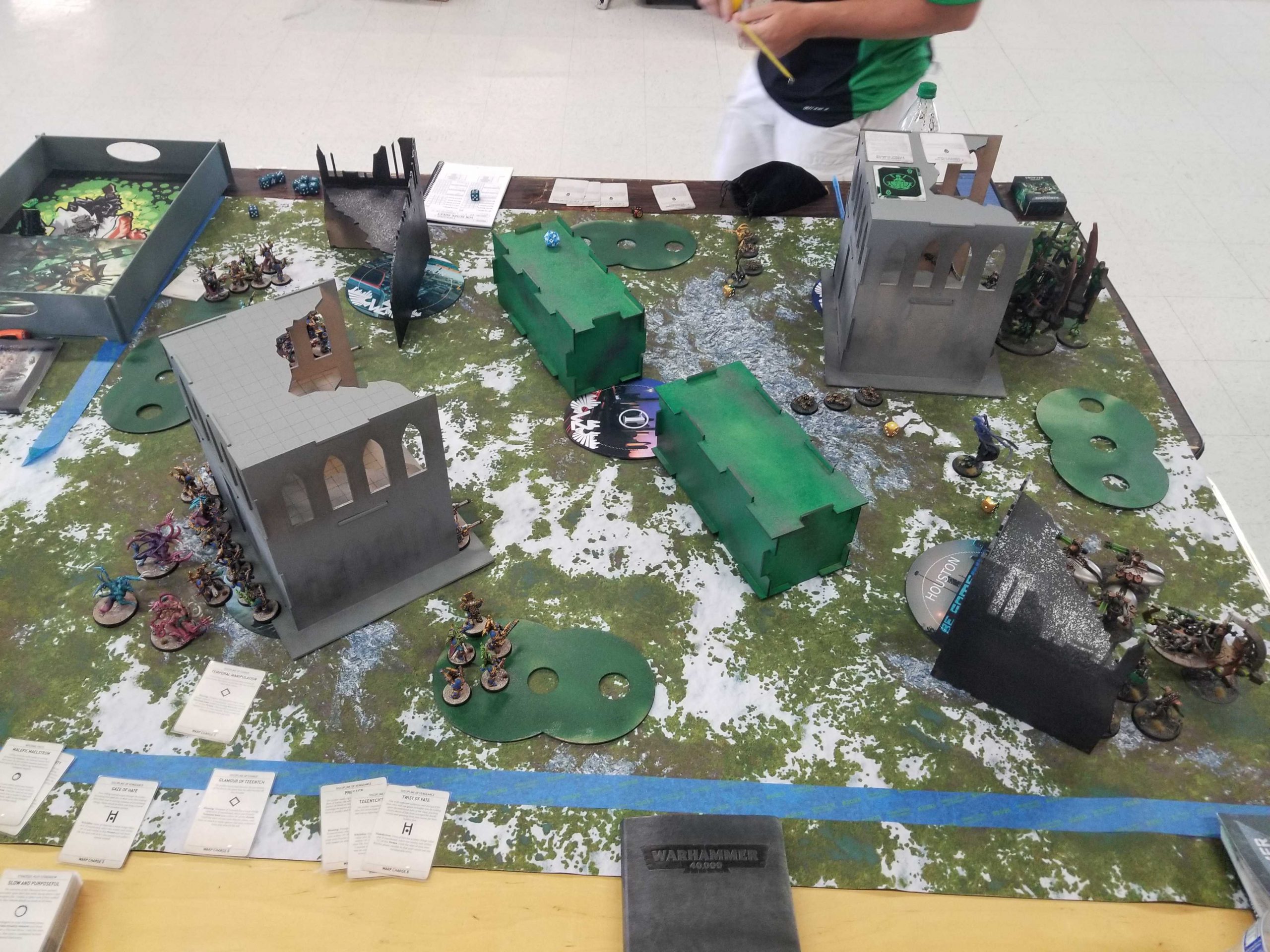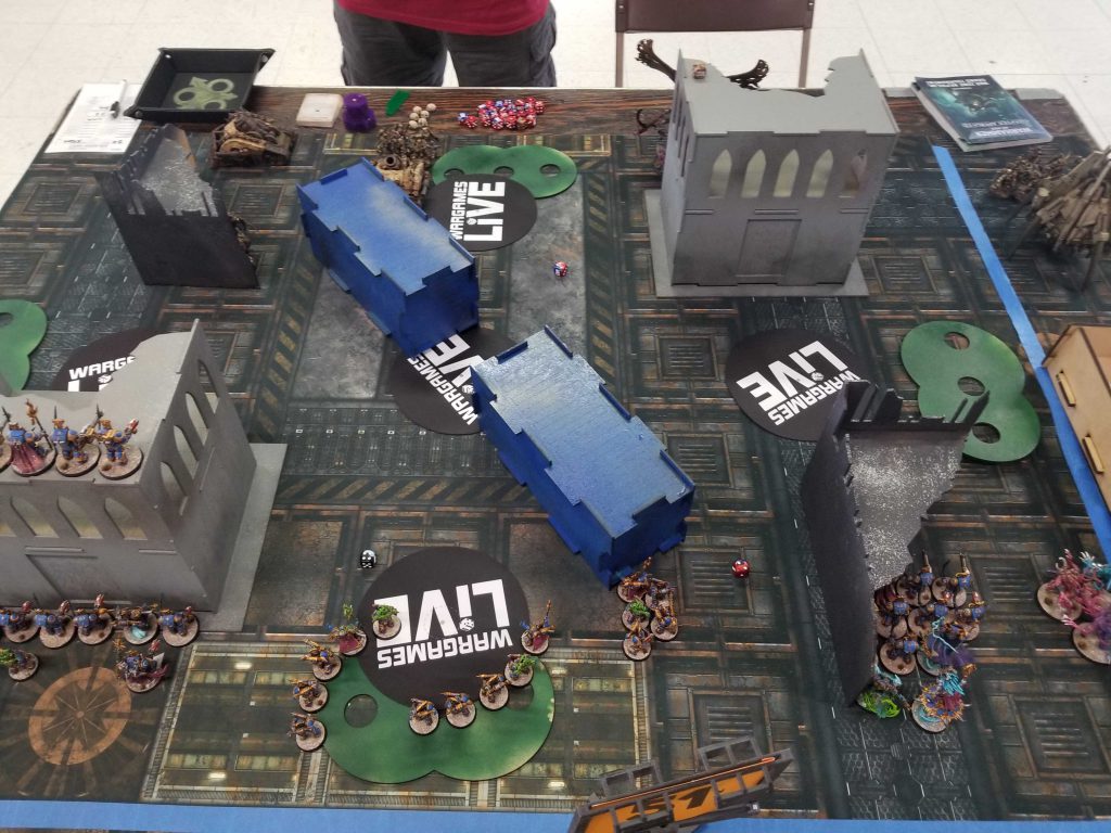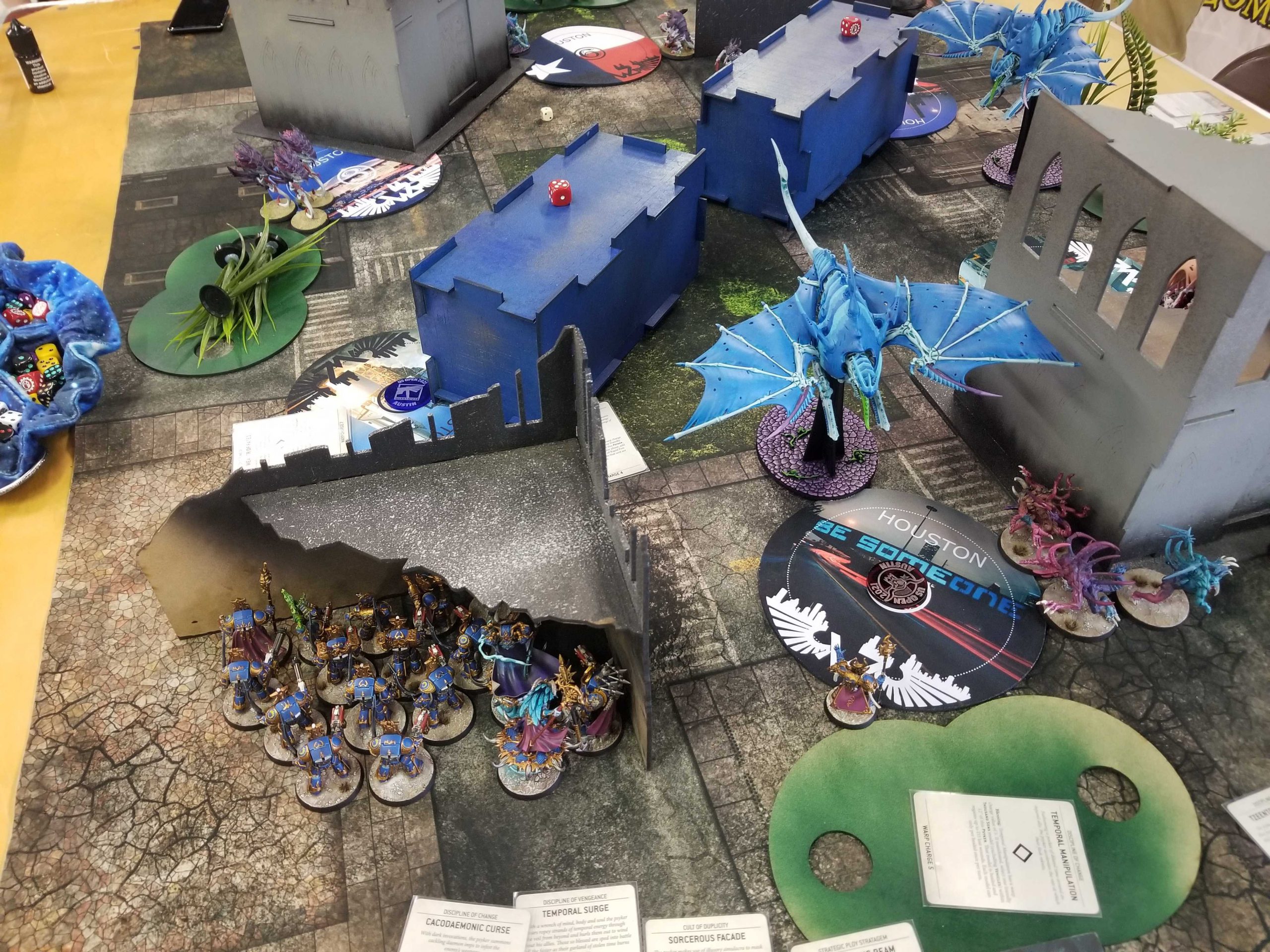 Credit: Greg Gonzalez Photo Credit: Robert "TheChirurgeon" JonesI'm mostly able to hold on at midfield and blank Greg on Behind Enemy Lines while he presses forward, taking out my terminators bit-by-bit as I fail save after save with them in what will become a running theme for the event. Things swing hard in my favor on turns 3 and 4 however when I'm able to kill three of Greg's characters. I teleport away from Mortarion on T3 with my Terminators and take him out with mortal wounds and terminator shooting. But the biggest one is the Daemon Prince - looking for an easy kill against a now undefended Ahriman - charges the sorcerer and does what Daemon Princes do, whiffing and dealing only 3 damage (dropping Ahriman to 2 wounds). Ahriman whiffs in response but in the following psychic phase pushes out an astonishing 6 mortal wounds on his Firestorm of Tzeentch cast, plus another 2 from a Cabal Point boost of D3 mortals, taking the Daemon Prince out and scoring me 3 more on Assassination.