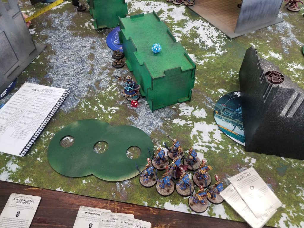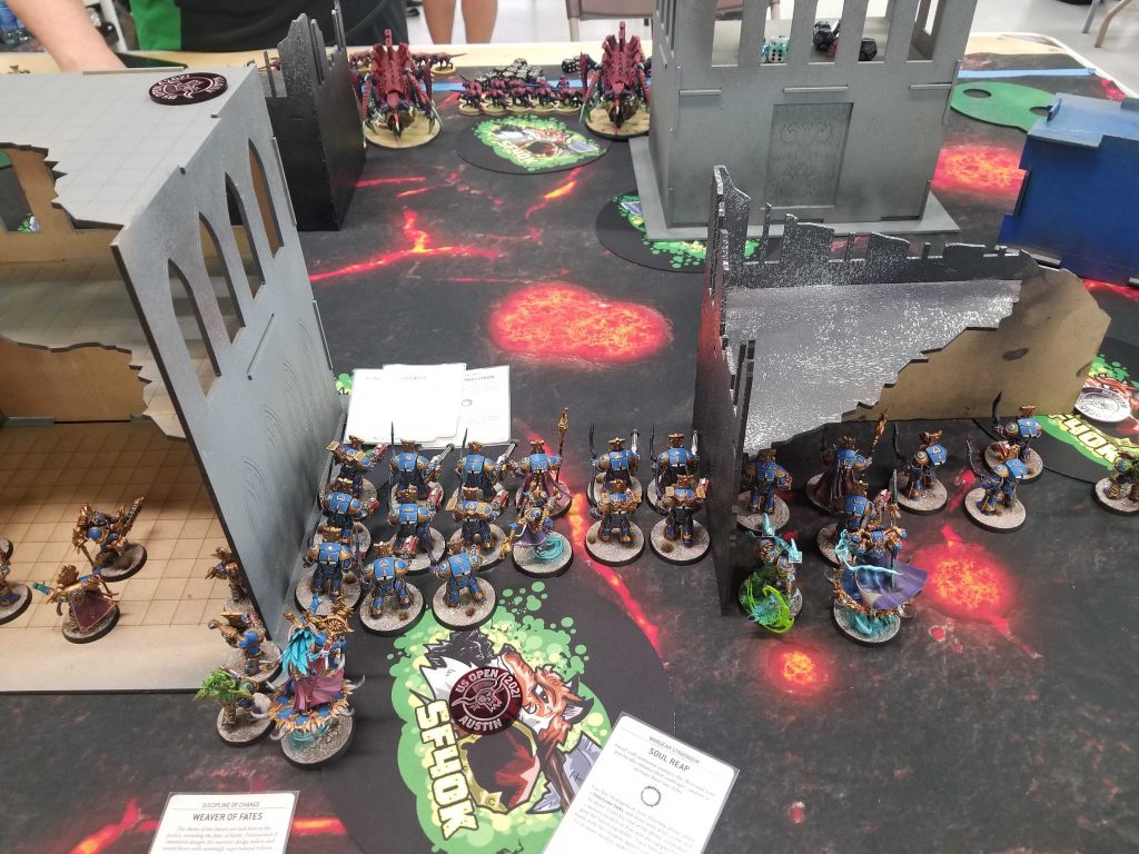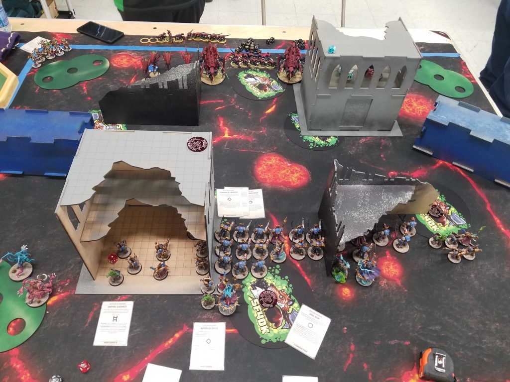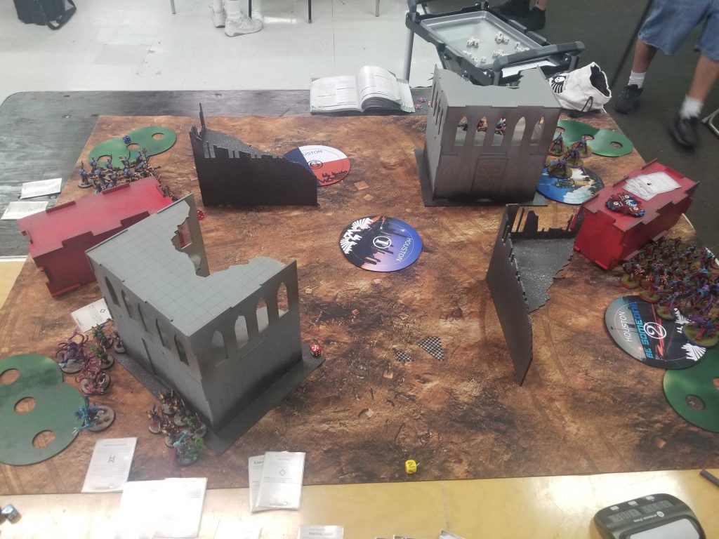 A Note on Terrain: The terrain at WarZone Houston used a fixed layout very similar to the GW ones, but players were allowed to rotate one piece of terrain in their territory before deployment, starting with the Defender. Most games I will end up rotating my large ruin toward the opponent, so I can use the cover while walking forward to get a safer approach.