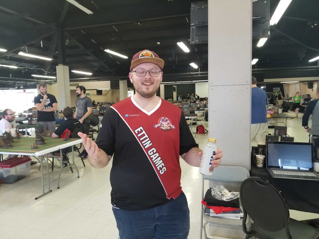 The worst photo I could possibly take of Chad from Team Ettin. Photo Credit: Robert "TheChirurgeon" JonesThree games down, three to go. I really wanted to go 3-0 on day two and snag my first 5-1 but I'd happily settle for a 4-2 again at this point. One of the other upsides to day 2 is less stuff to lug around: Paint judging is already done so I can leave the display board and the stupid temple at home.