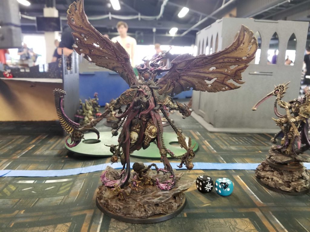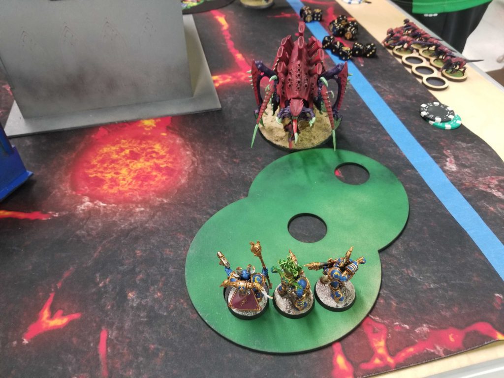 This Tervigon just failed the charge like a big fuckin idiot. Photo Credit: Robert "TheChirurgeon" JonesStephen's carnifexes arrive and kill a few terminators but mostly don't get there thanks to Glamour of Tzeentch and I kill two out of the three of them on the following turn. At this point Stephen asks if I want to talk it out and I am extremely up for that since it will mean going home early and being able to eat dinner with the family and do bedtime stuff with my son. We put in scores, then chat about families for a bit. Swell guy, that Stephen.