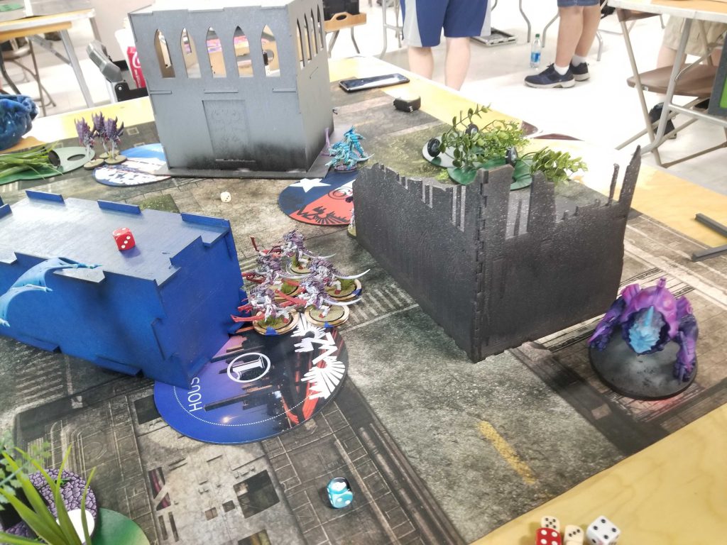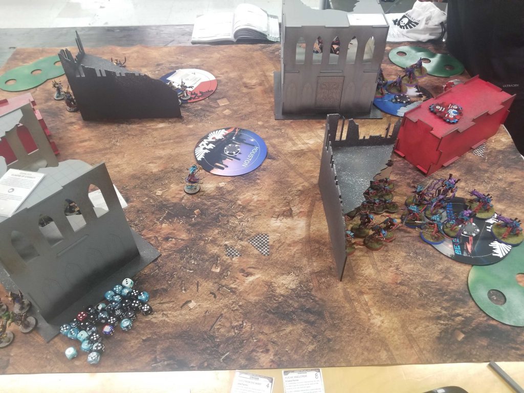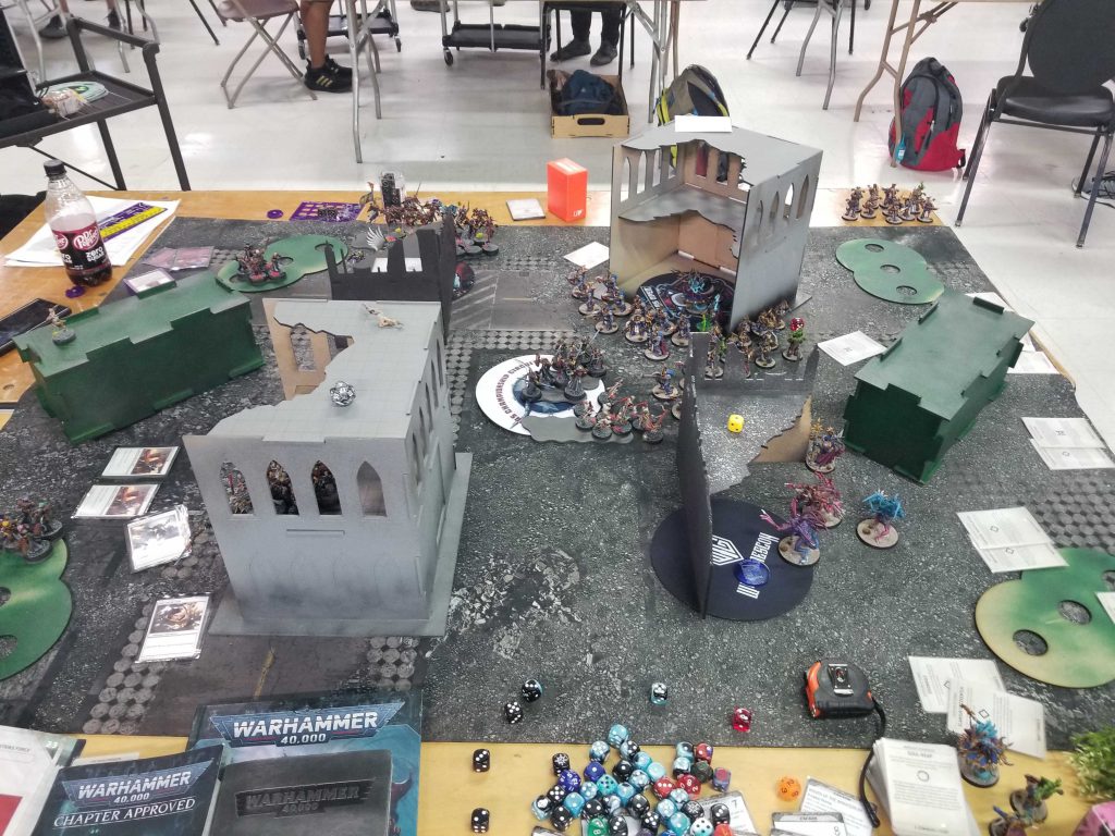 Photo Credit: Robert "TheChirurgeon" JonesI'd likely have won this game going second. As it was, it was a close enough game that some bad dice made the difference and I wasn't able to overcome a rough turn 1 and some clutch saves from his hive tyrant, harpies, and tyranid warriors, who also clung to life on turn 4 to put me off scoring 8 for primary plus Mutate Landscape on the final turn and took down a banner - a 9-point swing that wouldn't likely have won me the game but would have put me in a much better position.