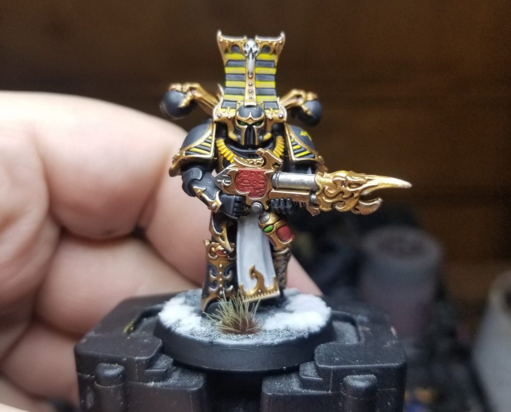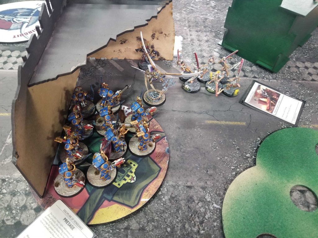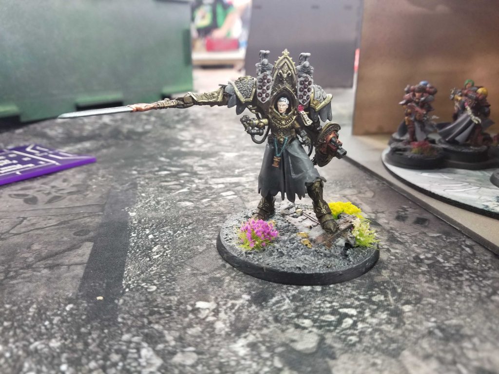 Hello, Celestine. Photo Credit: Robert "TheChirurgeon" JonesCelestine gets back up but Joe doesn't have the juice up there to kill the Terminators, and when Ahriman and two other characters show up to help I'm able to dust them off the objective. By turn 5, Joe's only got one objective with Vahl and Retributors on it, plus another character. He's able to score some mop-up points but I hold him to 9 on Abhor and 30 on Primary, while managing 41 of my own thanks to three strategic scans.